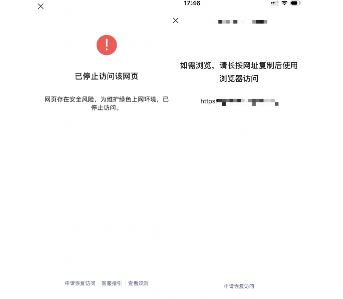 若确认内容合规,可在提示页面点击「申请恢复访问」进行申诉。