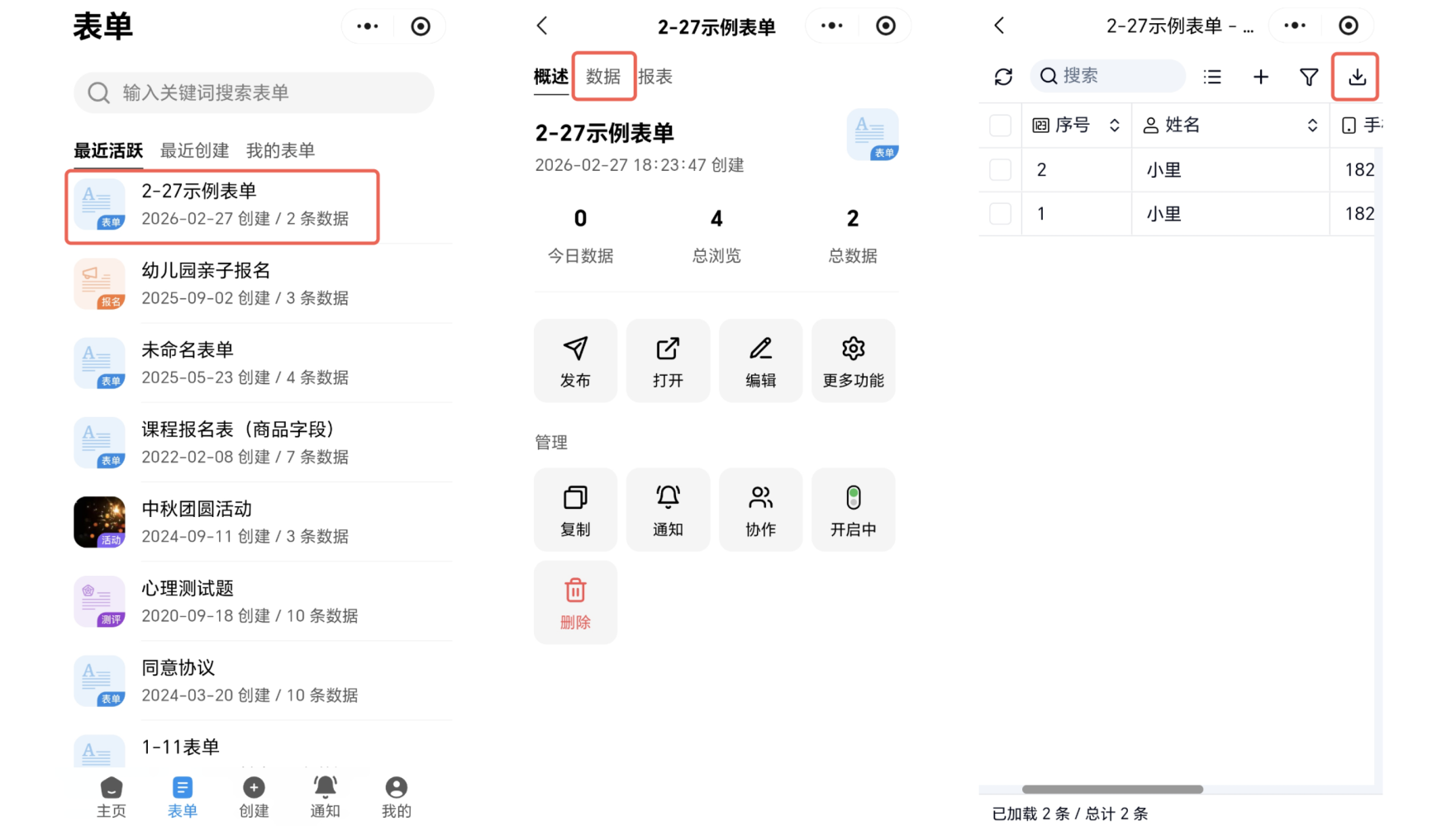 公众号点左下角点击进入「表单」页面,找到你需要导出数据的表单点击进入,然后点击顶部正中间的「数据」进入数据页面