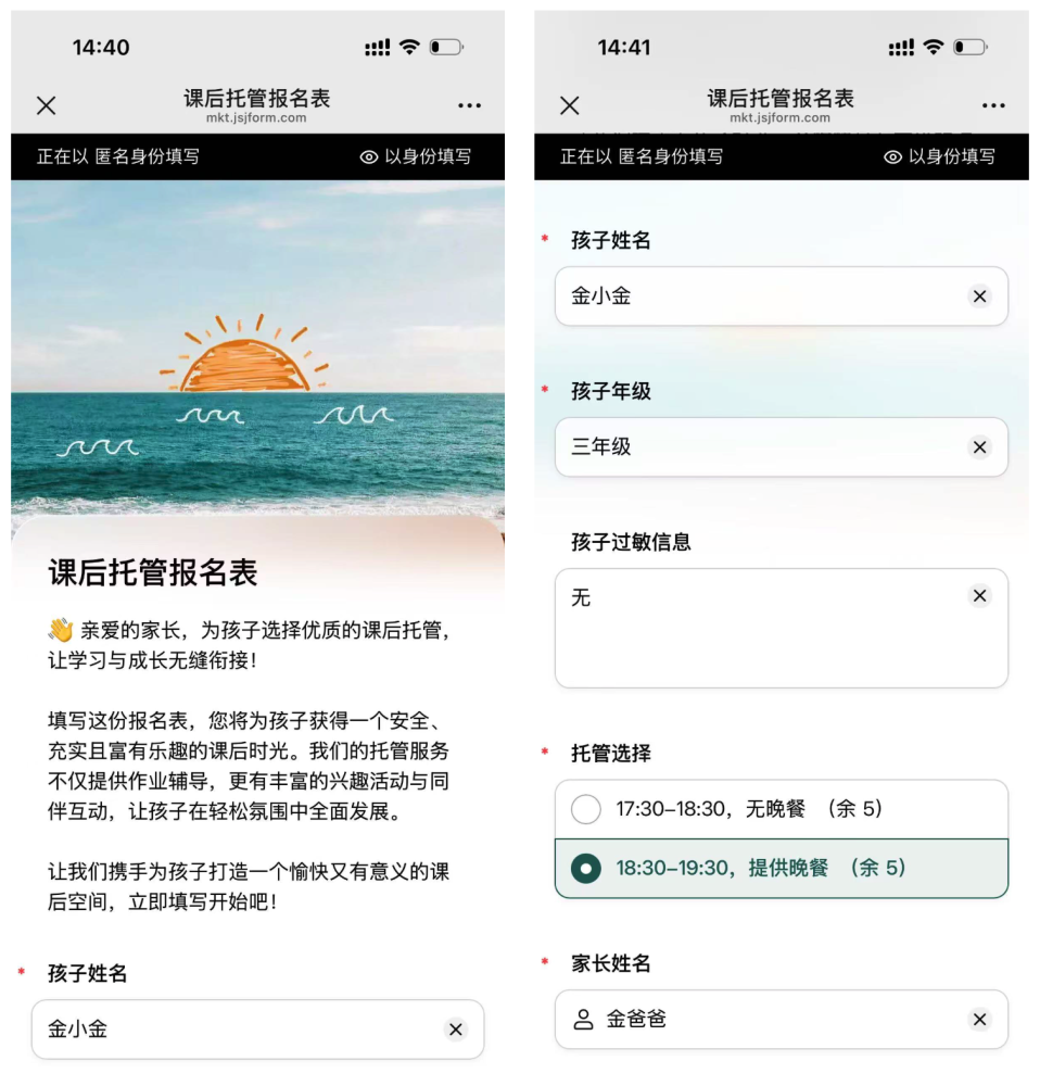 对于没有技术团队、需要快速上线的托管机构来说,金数据是一个门槛很低的选择:无需开发,深度融入微信生态,负责人自己就能搭建报名表,设置时段、收费、收集学生信息,生成链接或二维码直接发给家长,报名数据自动汇总。从搭建到上线,通常当天就能完成。