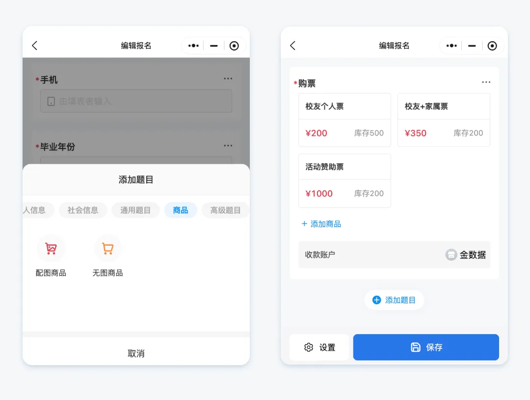 报名即收款,一张表搞定:在报名表中添加「商品」字段,填写者提交时直接完成支付。报名信息与付款记录自动绑定,告别对账混乱。