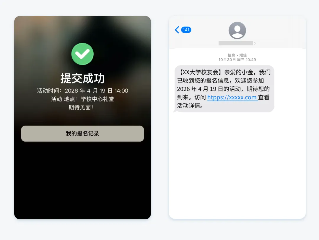 支付成功后,校友会收到即时的支付凭证,甚至可根据需要配置短信提醒,在支付成功后自动发送确认消息,这种专业感会极大增强校友对组织方的信任。