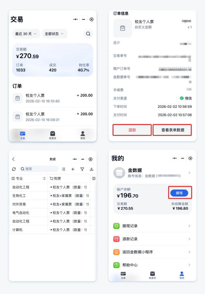 活动报名期间,你可以实时在小金商户助手「交易」页面查看流水,并管理订单。报名结束后,在「我的」页面发起提现,资金将结算至你绑定的银行账户中。
