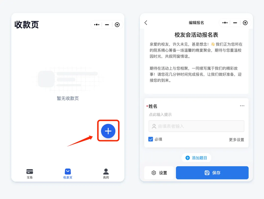 在「收款」页,点击「+」创建收款表单,在表单内添加姓名、手机等基础字段。