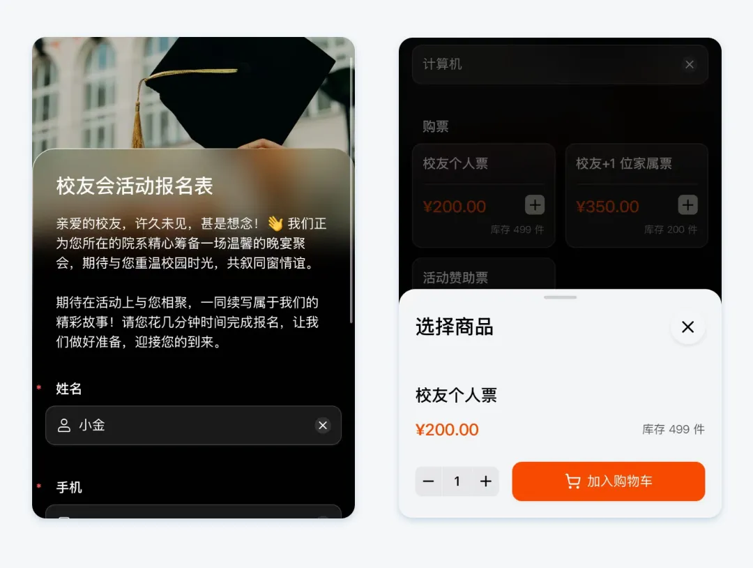 当校友在微信群或公众号中点击活动链接/扫描二维码后,会直接进入一个简洁美观的报名页面。填写完基础信息后,直接点击「提交」,即可流畅在微信内支付。