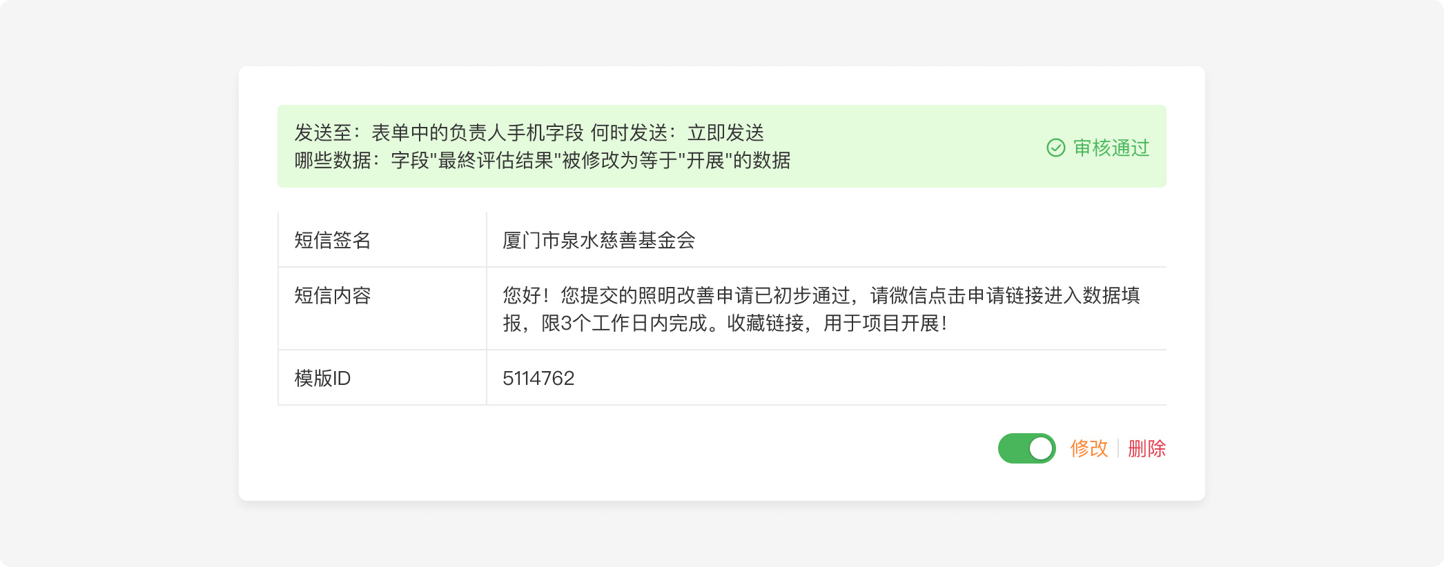 现在,通过金数据的自动化功能,可以根据流程进度实时触发短信提醒,让受捐助学校第一时间知晓项目进度,增强学校对公益项目的信任感。