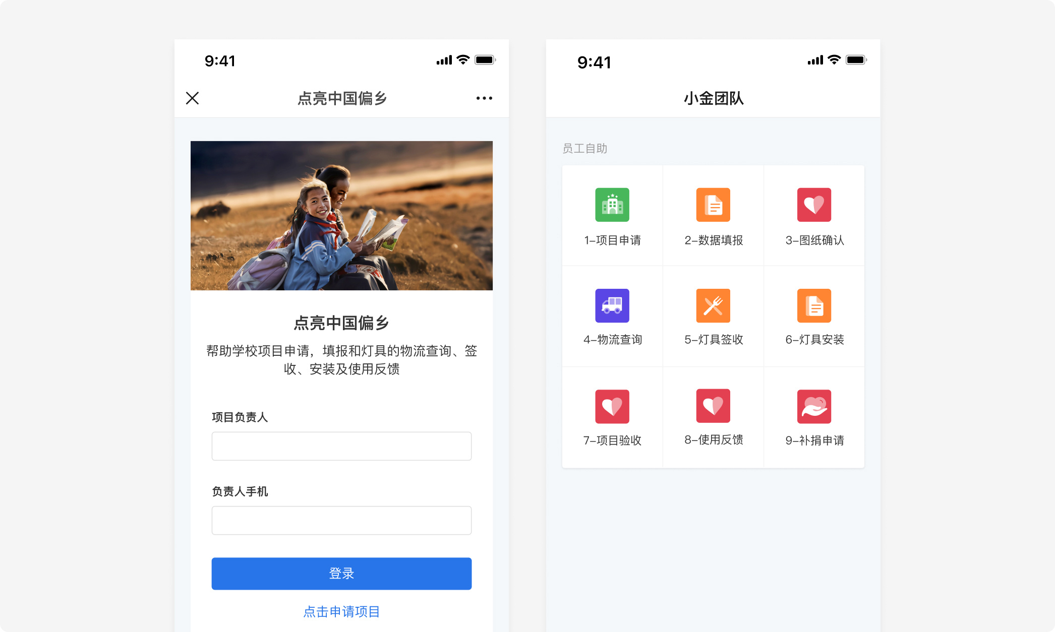 一个学校申请「点亮中国偏乡」公益项目的流程,涵盖了从数据填报→方案确认→接受物资→灯具安装→灯具验收→使用反馈的多个阶段。以往,学校老师想要追踪项目进展,只能依靠「眼盯口催」,直接找项目组工作人员了解进度,十分不便。