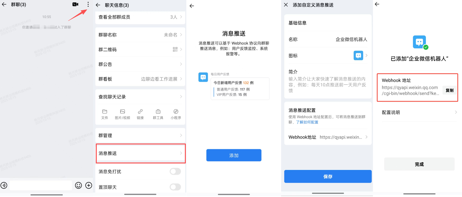 打开手机端企业微信 App ,打开一个内部群聊(外部群不支持) — 点击右上角图标进入到群聊设置 — 来到消息推送页面添加自定义消息推送,添加完成后出现的页面,请点击 Webhook 地址后的复制按钮。