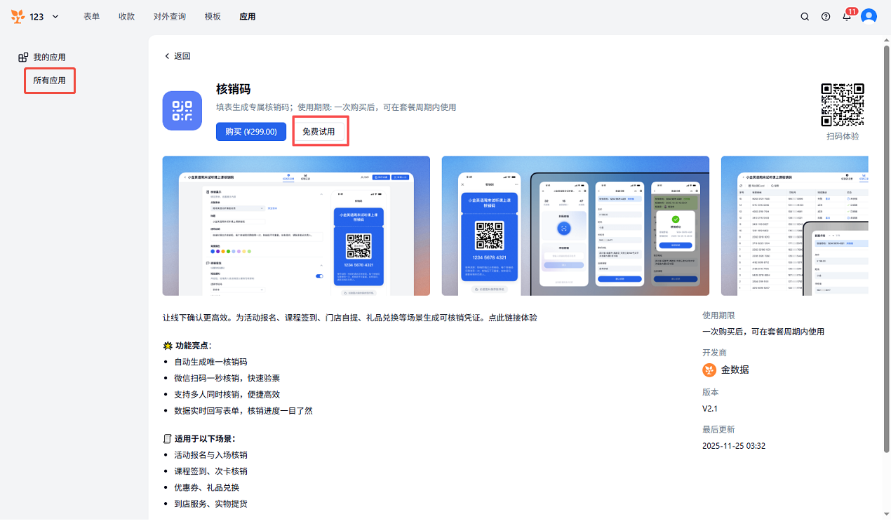 在「营销中心——我的应用」找到「核销码」后,左边选择「免费试用」,试用期为 24 小时,试用到期后,将无法进入应用,请及时购买。