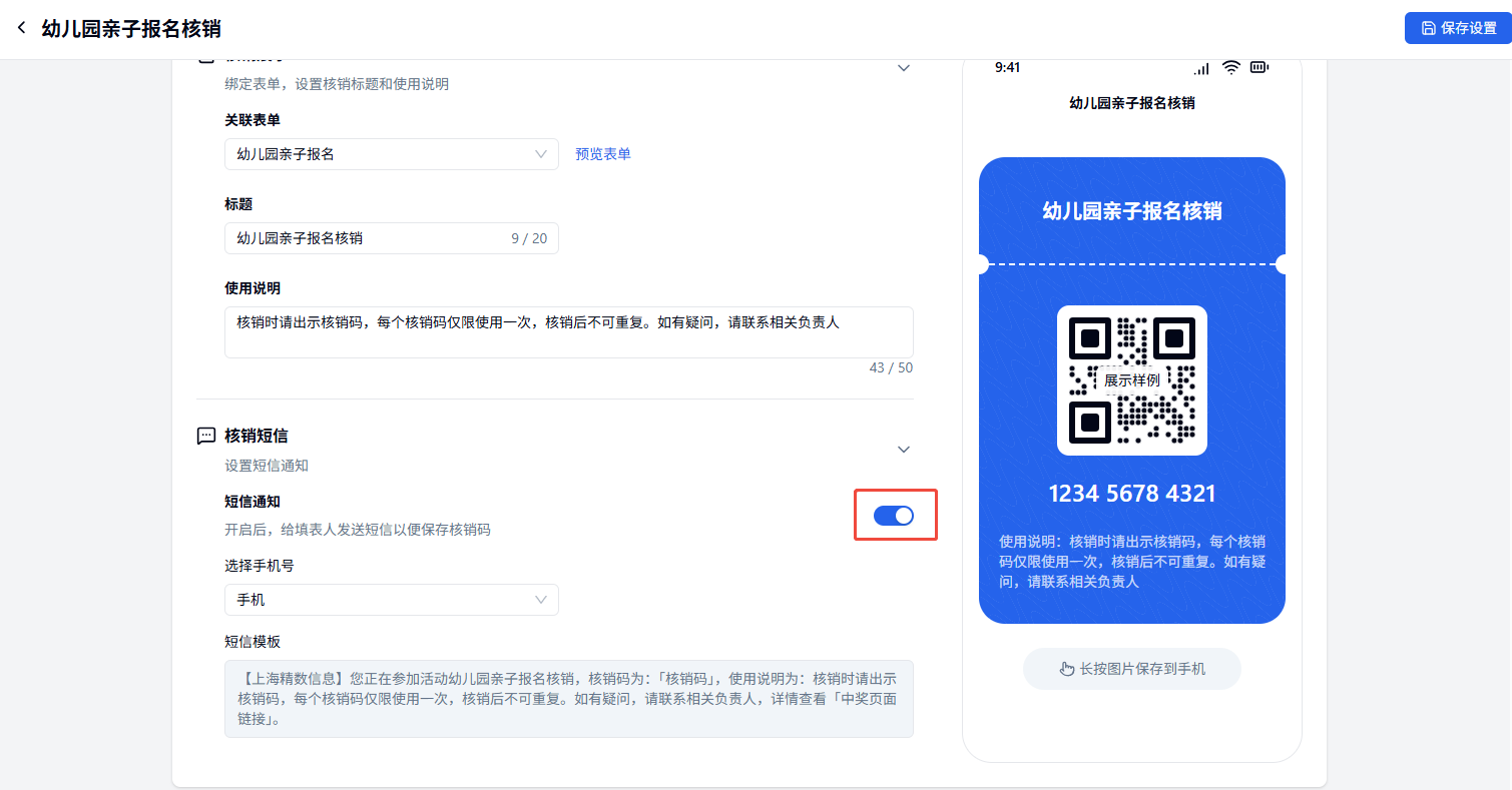 如果你想填表人通过短信接收核销码,可以开启「短信通知」,表单需要添加「手机」字段,会消耗套餐的短信量。填表人收到短信后,点击短信中的链接可以直接获取核销码。导入的数据也会触发短信提醒。