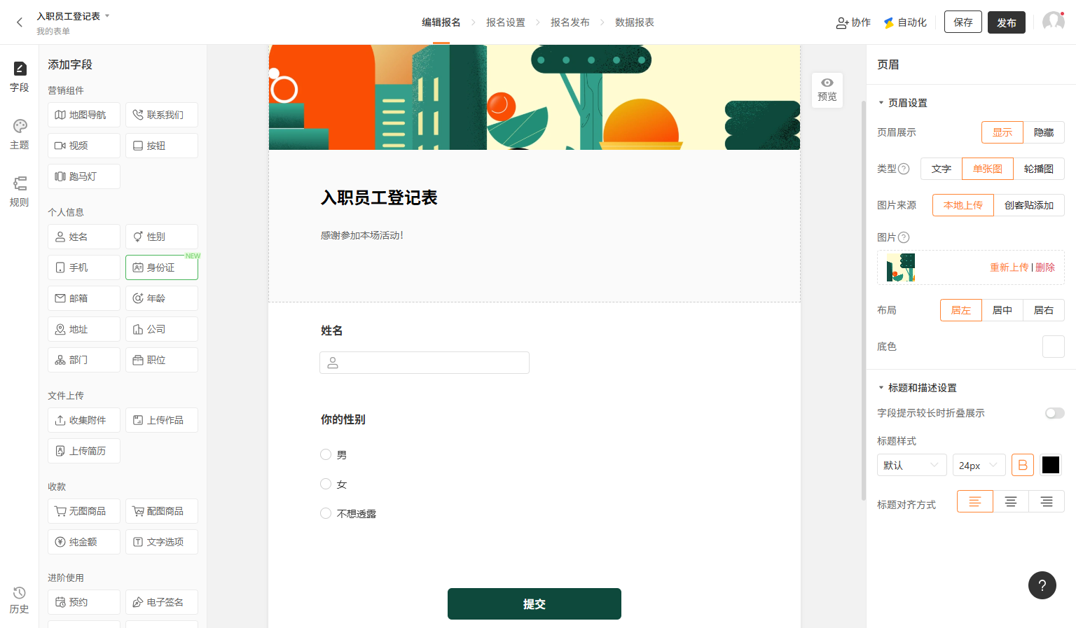 3.创建一个「入职人员登记表的表单」。该表单有姓名、性别等等。