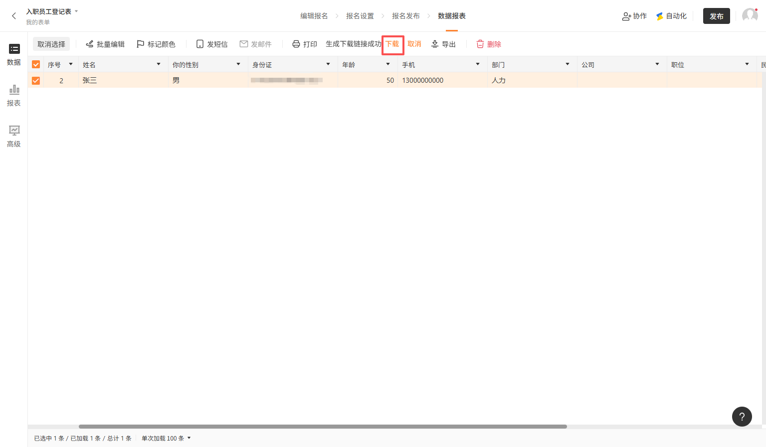 示例背景:HR 制作了一个入职人员登记表的表单,让应聘人员填写自己的个人信息然后参加面试。面试通过后需要将入职人员人员的信息打印到特定样式的 Word 中,以做存档。如果手动一条数据一条数据复制粘贴,工作效能较低,使用自定义打印功能可以一键打印到 Word 中。操作步骤如下所示。
