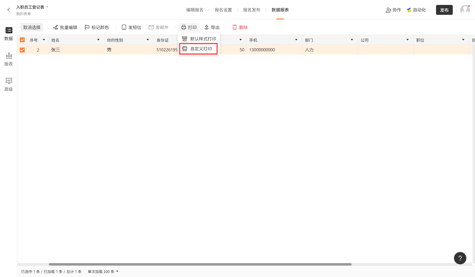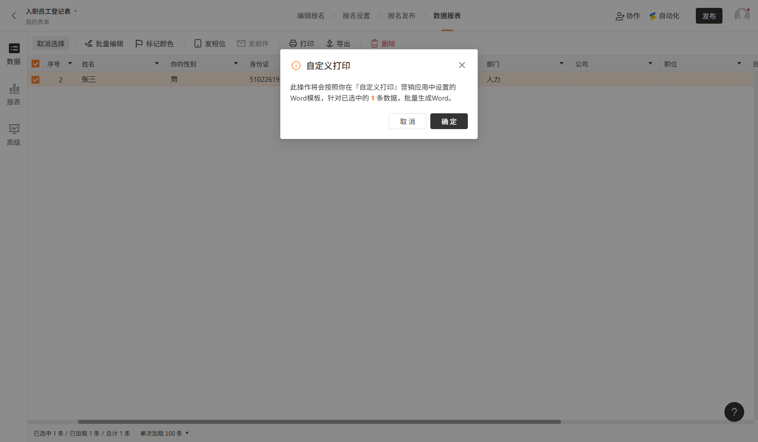进入绑定的表单「数据」页面,点击「打印—自定义打印」,可生成下载链接,实现批量打印数据为自定义的 Word 文档,一次最多可批量打印 500 条数据。单条数据打印为一条数据一个 Word 文件,批量打印是多条数据在一个 Word 文件并按页拆分。