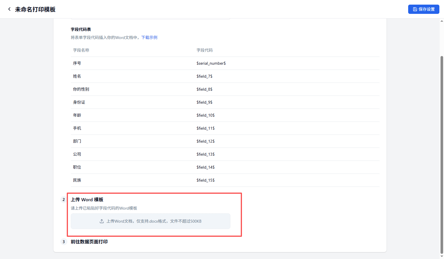 2.绑定已创建好的「入职人员登记表的表单」,将「字段代码表」中需要打印的字段代码复制,粘贴到 Word 模板文档中对应的位置,如下图所示。