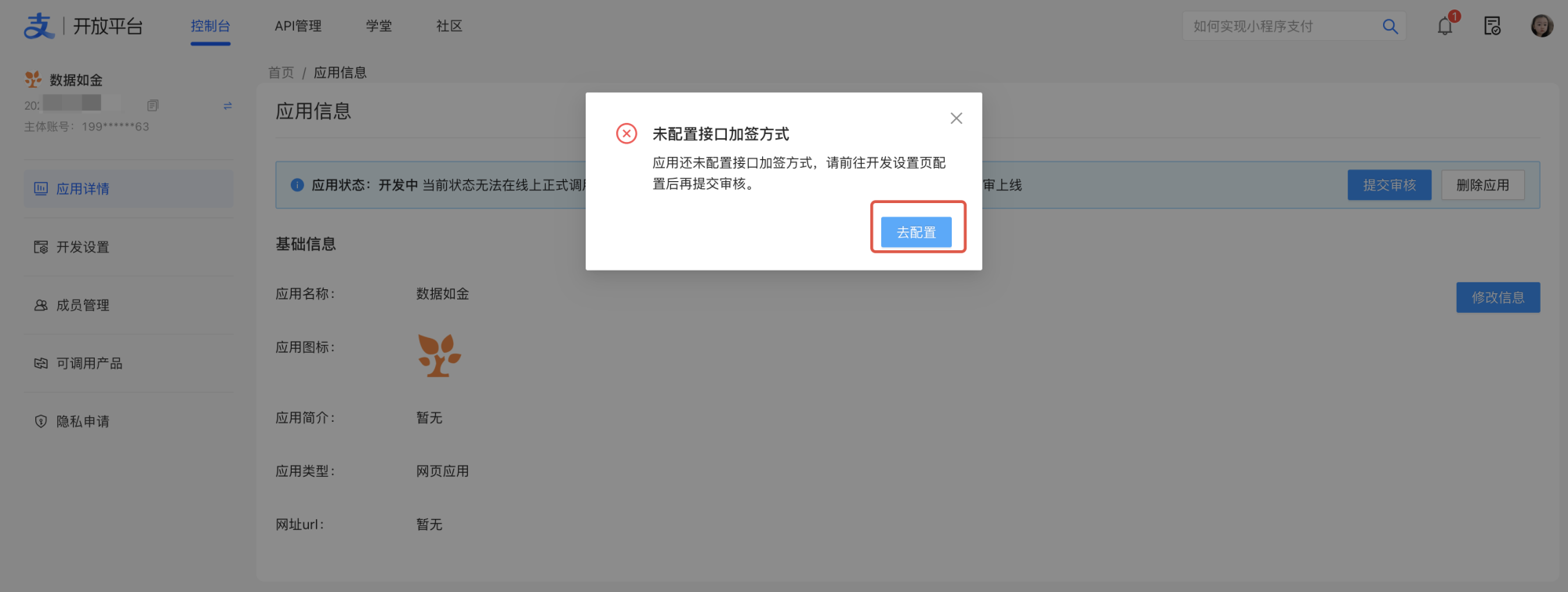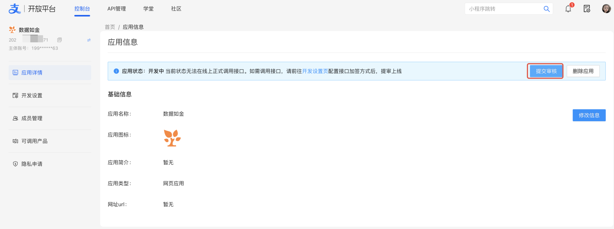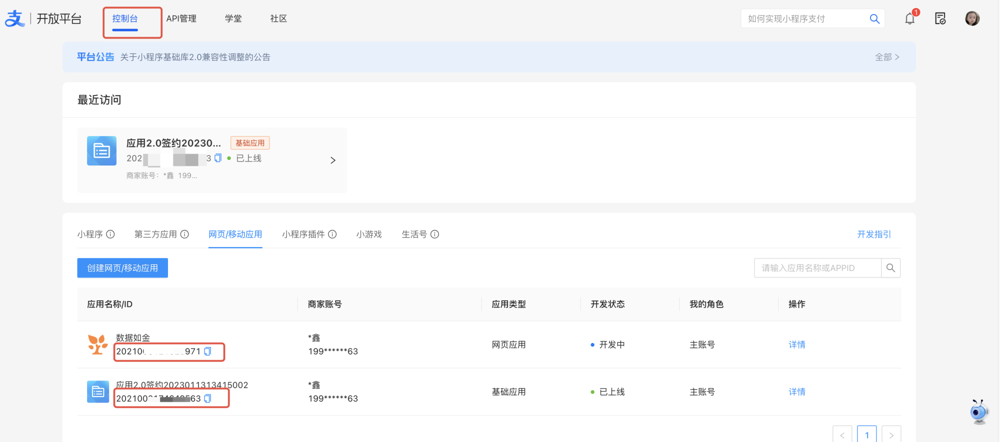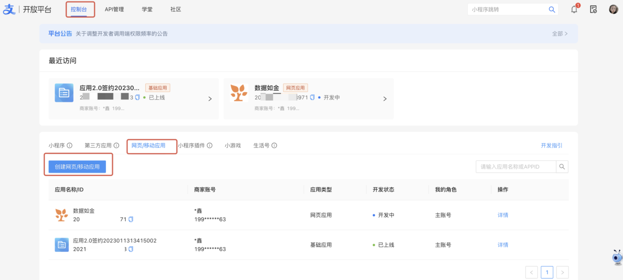 进入 支付宝开放平台,点击「控制台—网页/移动应用」创建应用。
