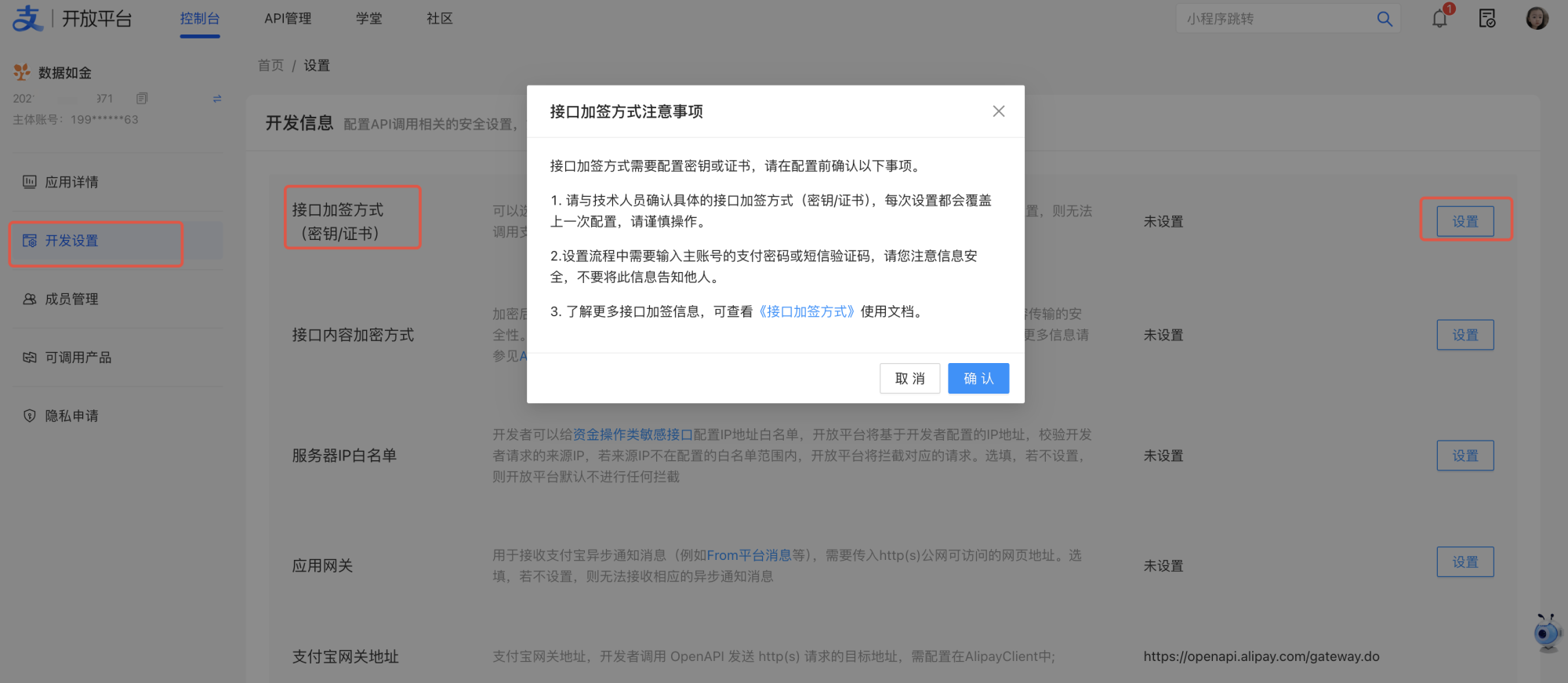 2.选择「接口加签方式(密钥/证书)——点击设置」,注意事项点击「确认」。