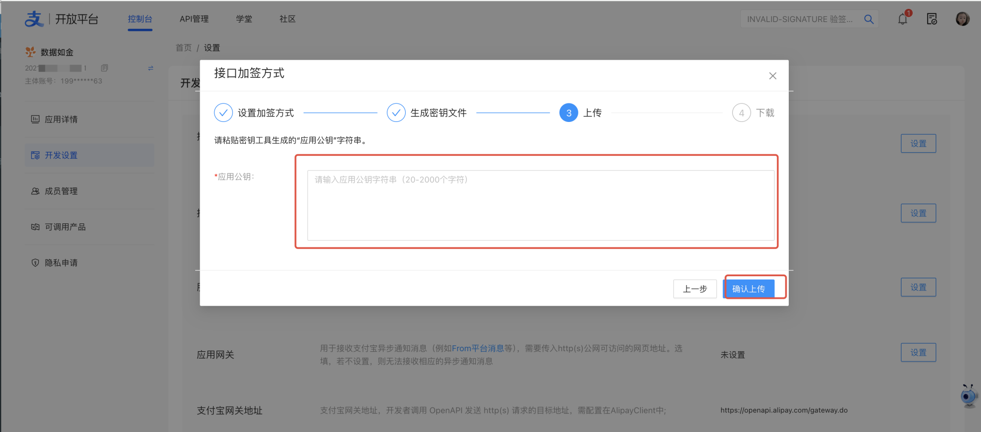 5.上传生成好的「应用公钥」,获得的支付宝公钥一定要保存,在金数据配置支付宝时使用。