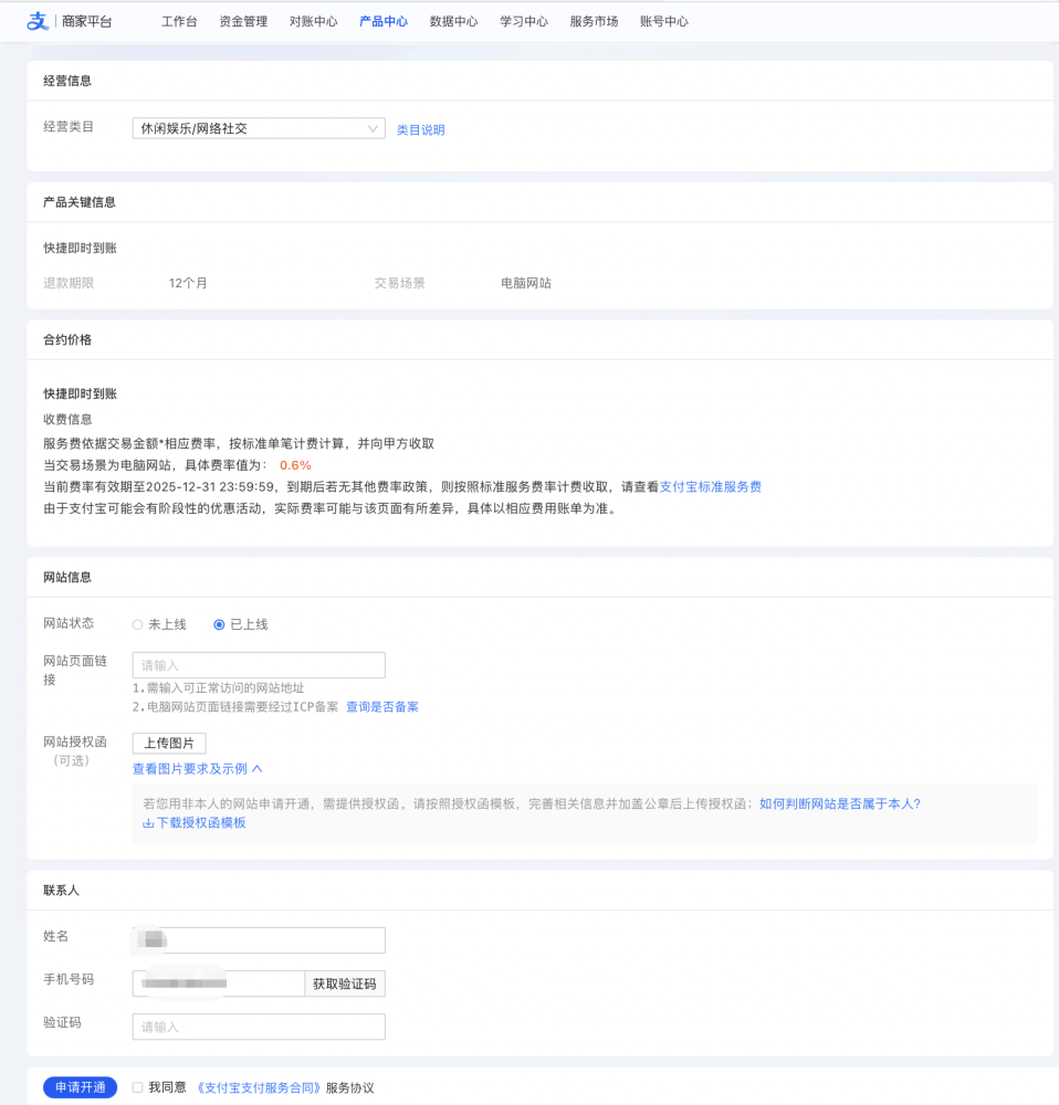 2.根据页面提示选择自己的经营类目、网站信息后点击「申请开通」。