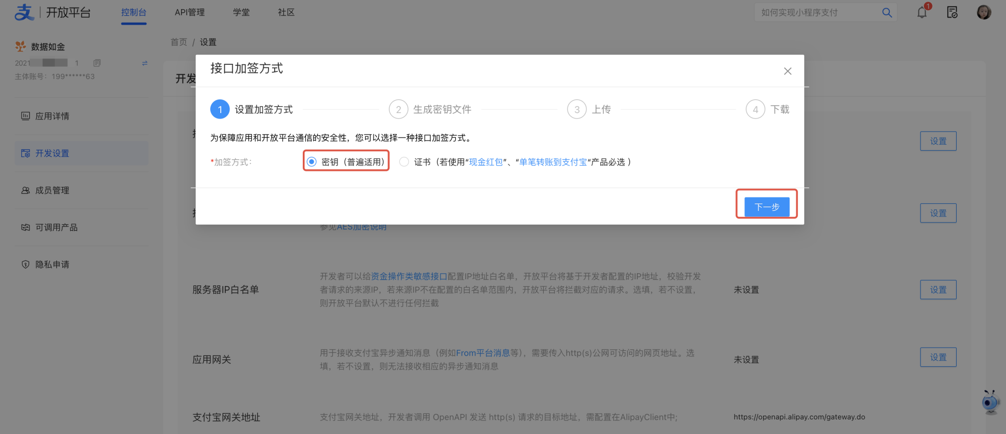 3.设置加签方式选择「密钥」点击「下一步」。