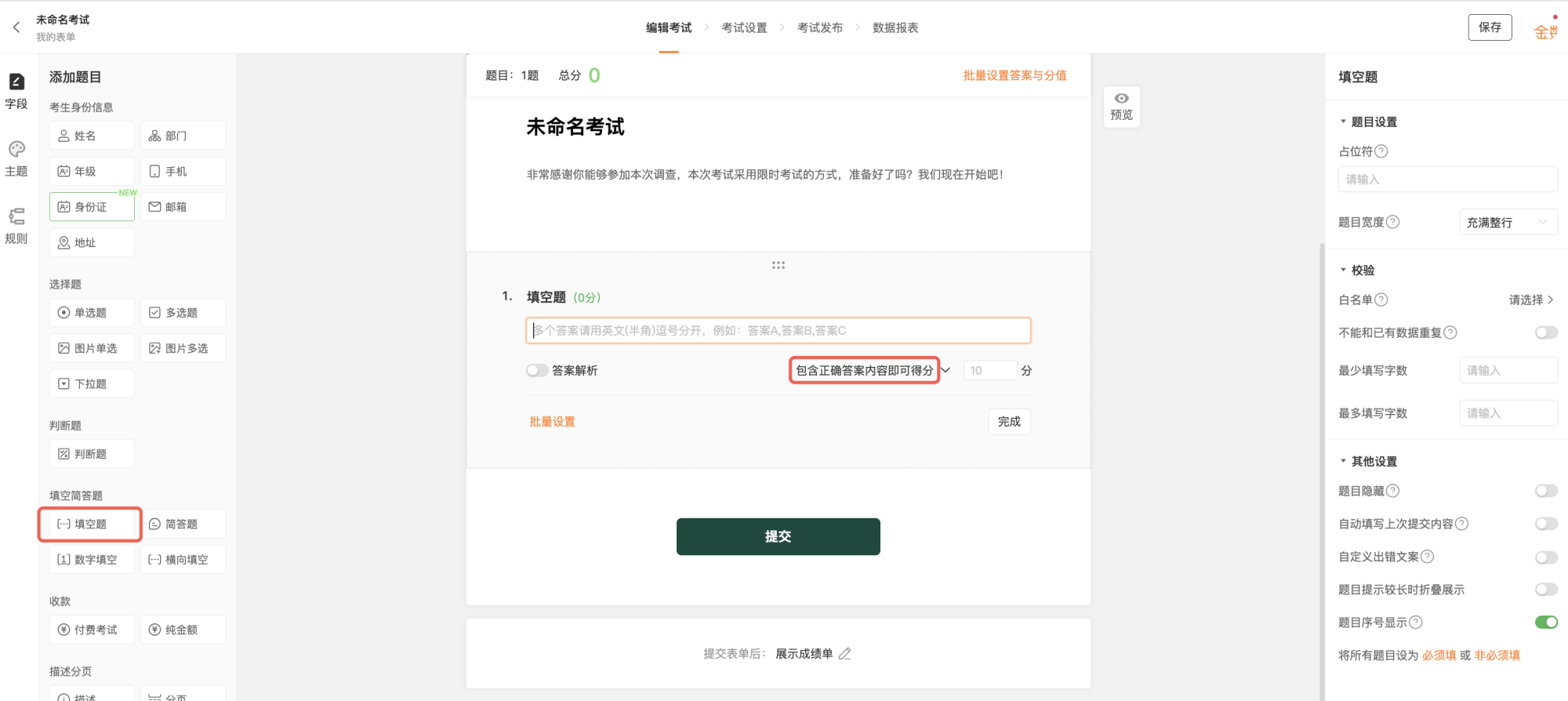 「考试」场景下的「填空题」字段,若同一题包含多个正确答案,可将「填空题」计分方式设置为「包含正确答案内容即可得分」,多个答案请用英文(半角)逗号分开,例如:答案A,答案B,答案C