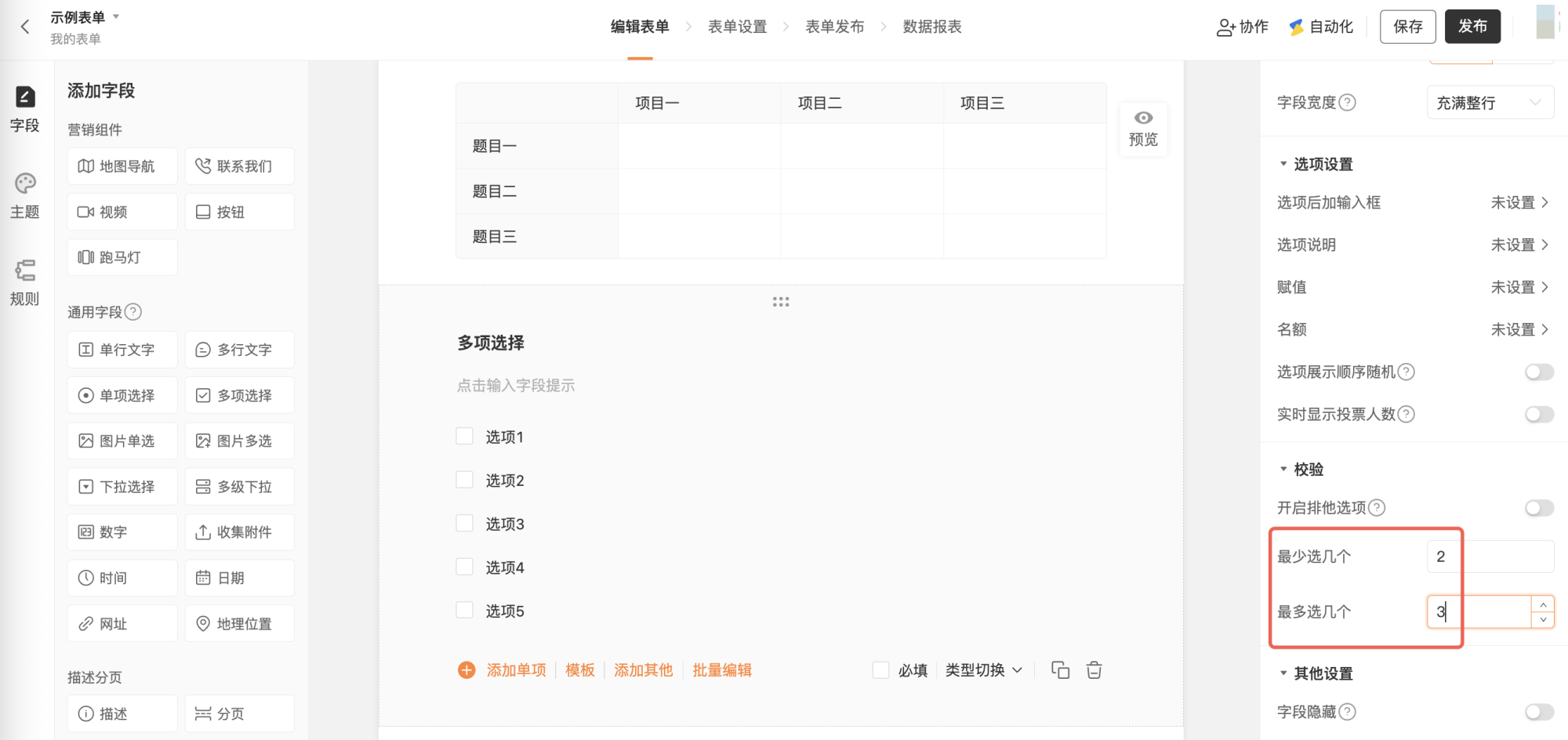 多项选择字段右侧编辑栏,可设置「最多/最少选几个」功能,限制填表人选择的选项个数。