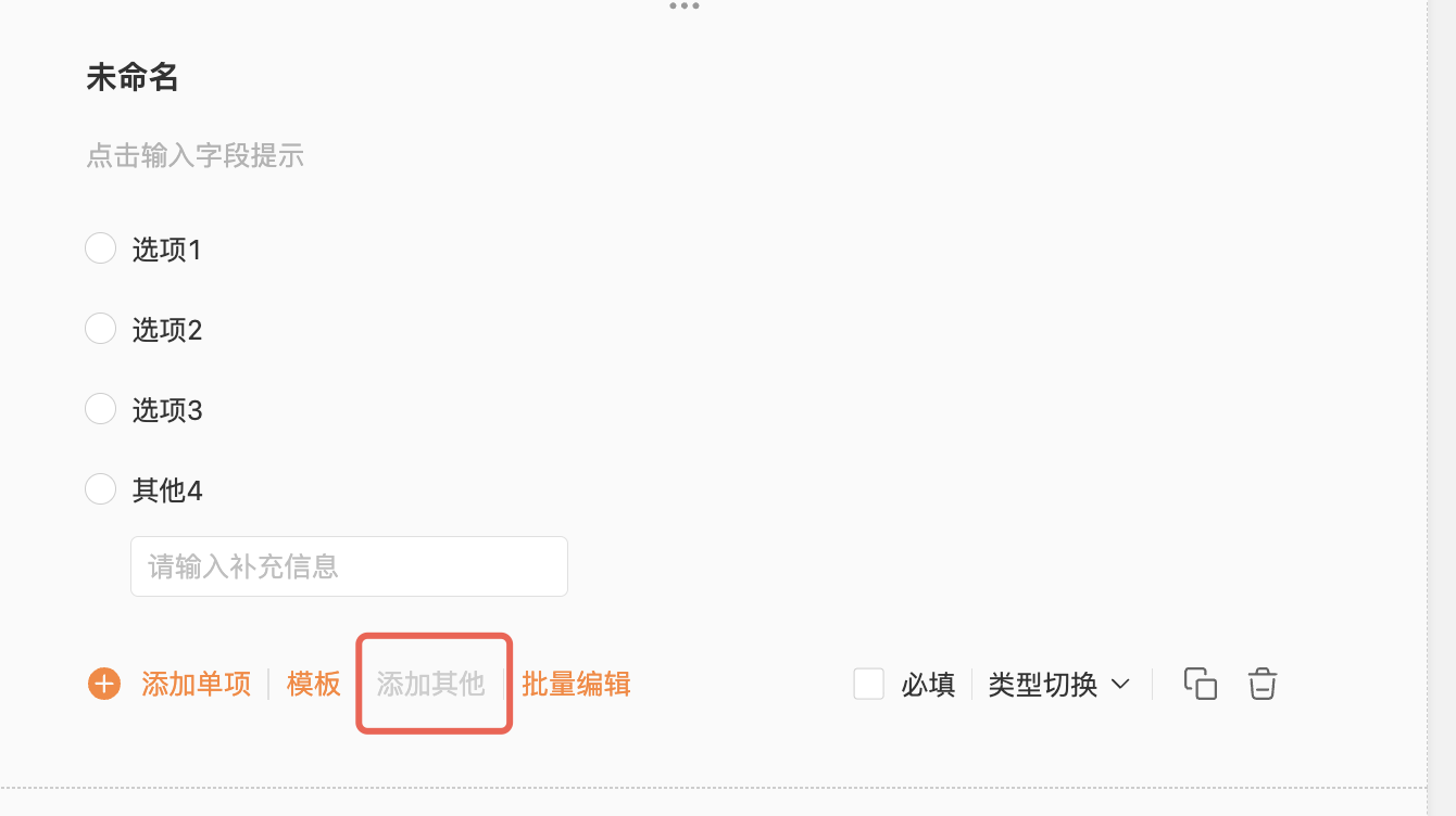 如果需要开启「选项展示顺序随机」功能,同时希望有一个选项固定在最底下不参与展示顺序随机,请在字段下方有一个黄色的字体「添加其他」,这个「其他选项」不会参与「选项展示顺序随机」而是固定在最后面,但是不能设置输入框的占位符。