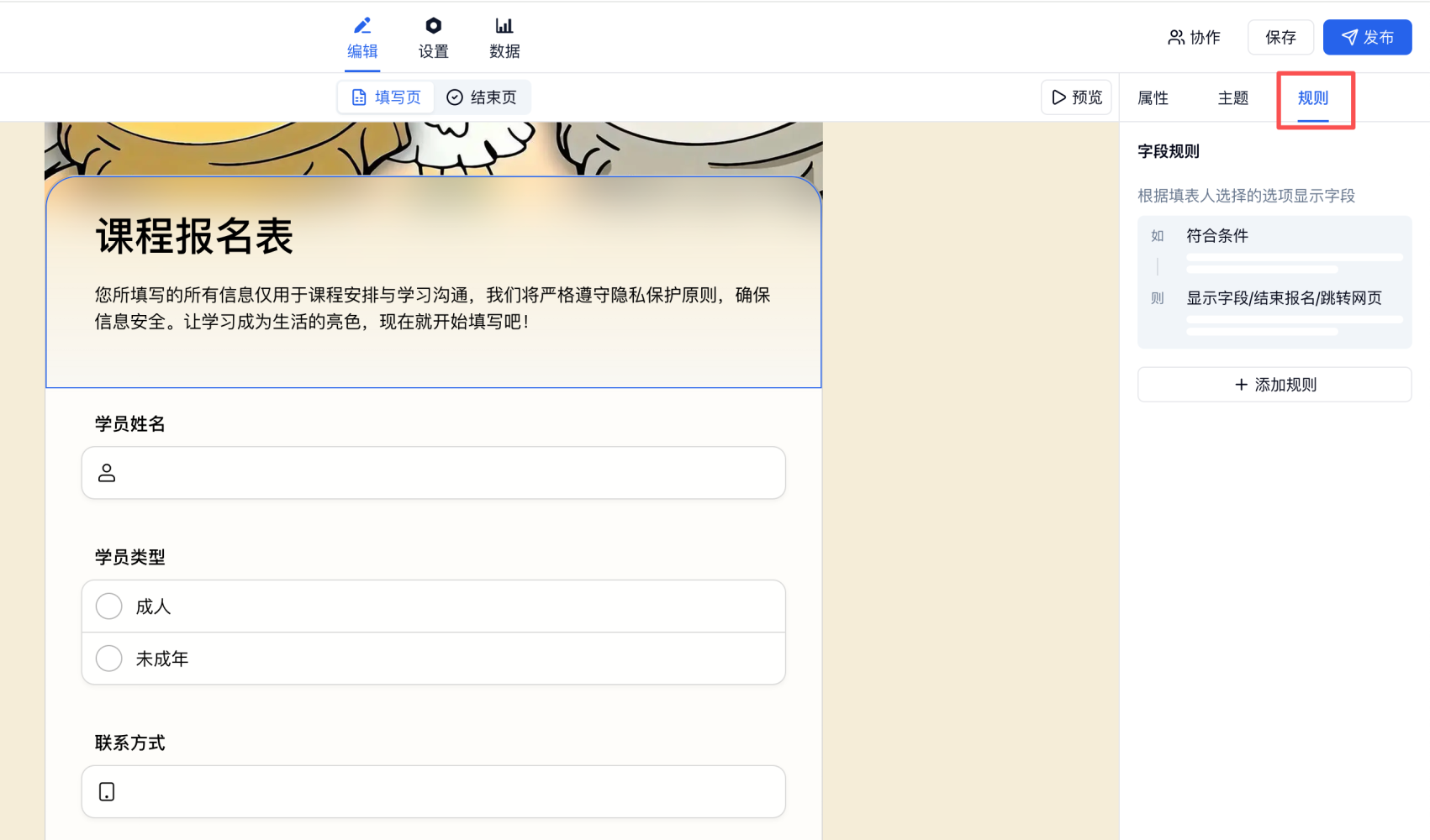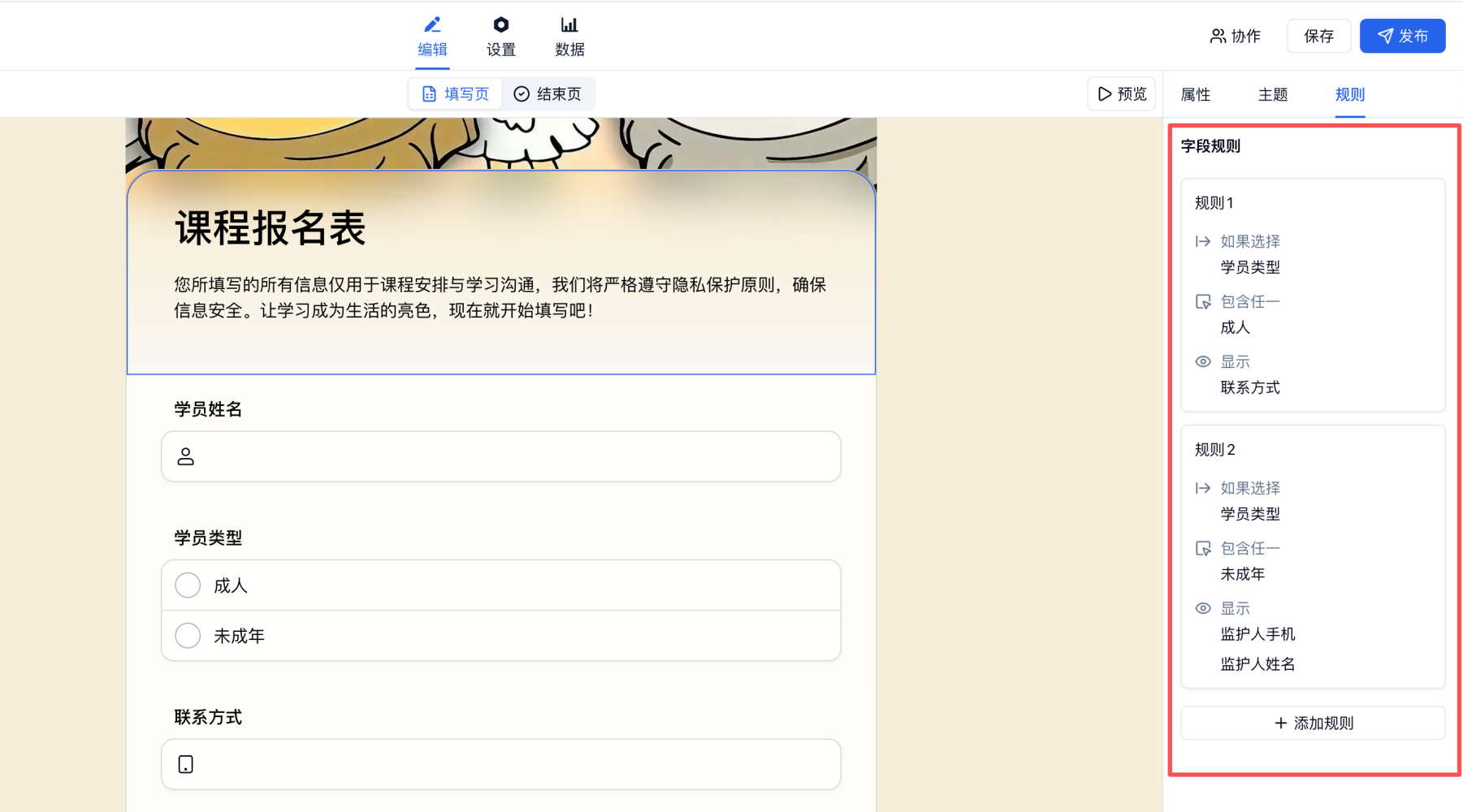 规则 2:在「学员类型」包含任一「成人」则显示「联系方式」