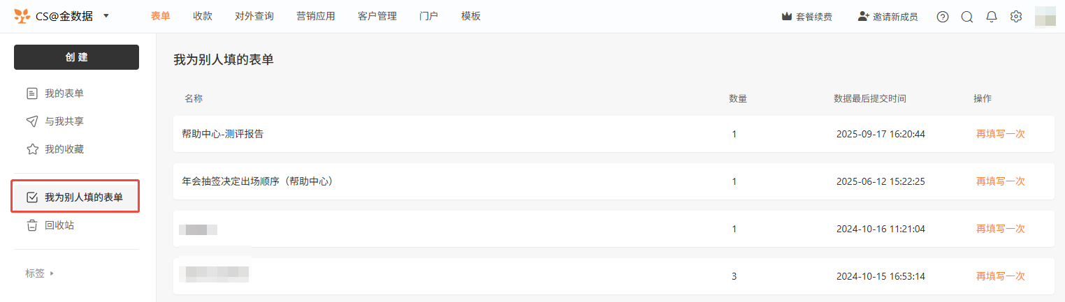 在 电脑端登录 金数据账号后,在左侧「我为别人填的表单」查看历史填写过哪些表单,点击表单名称可以查看详细填表数据。