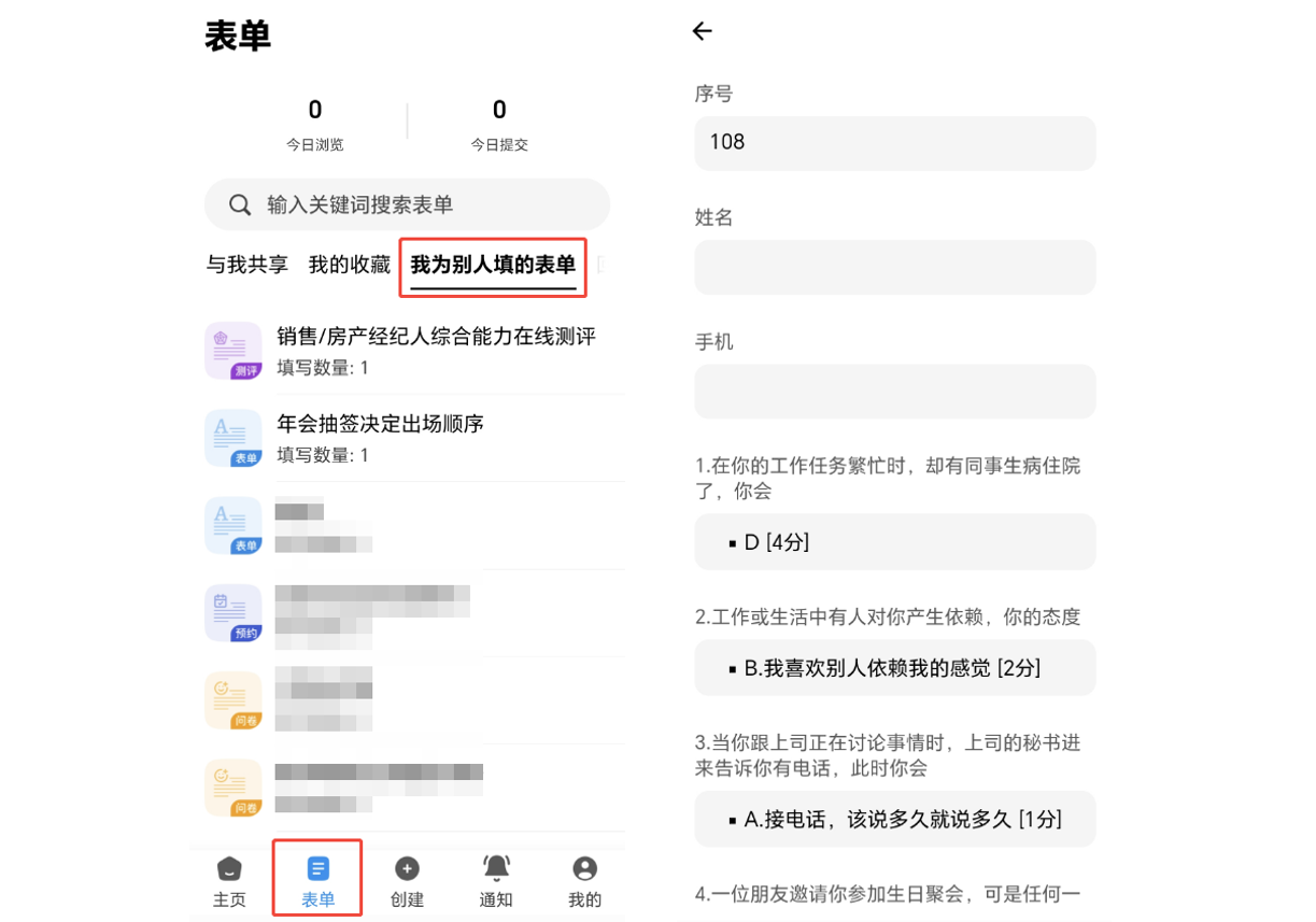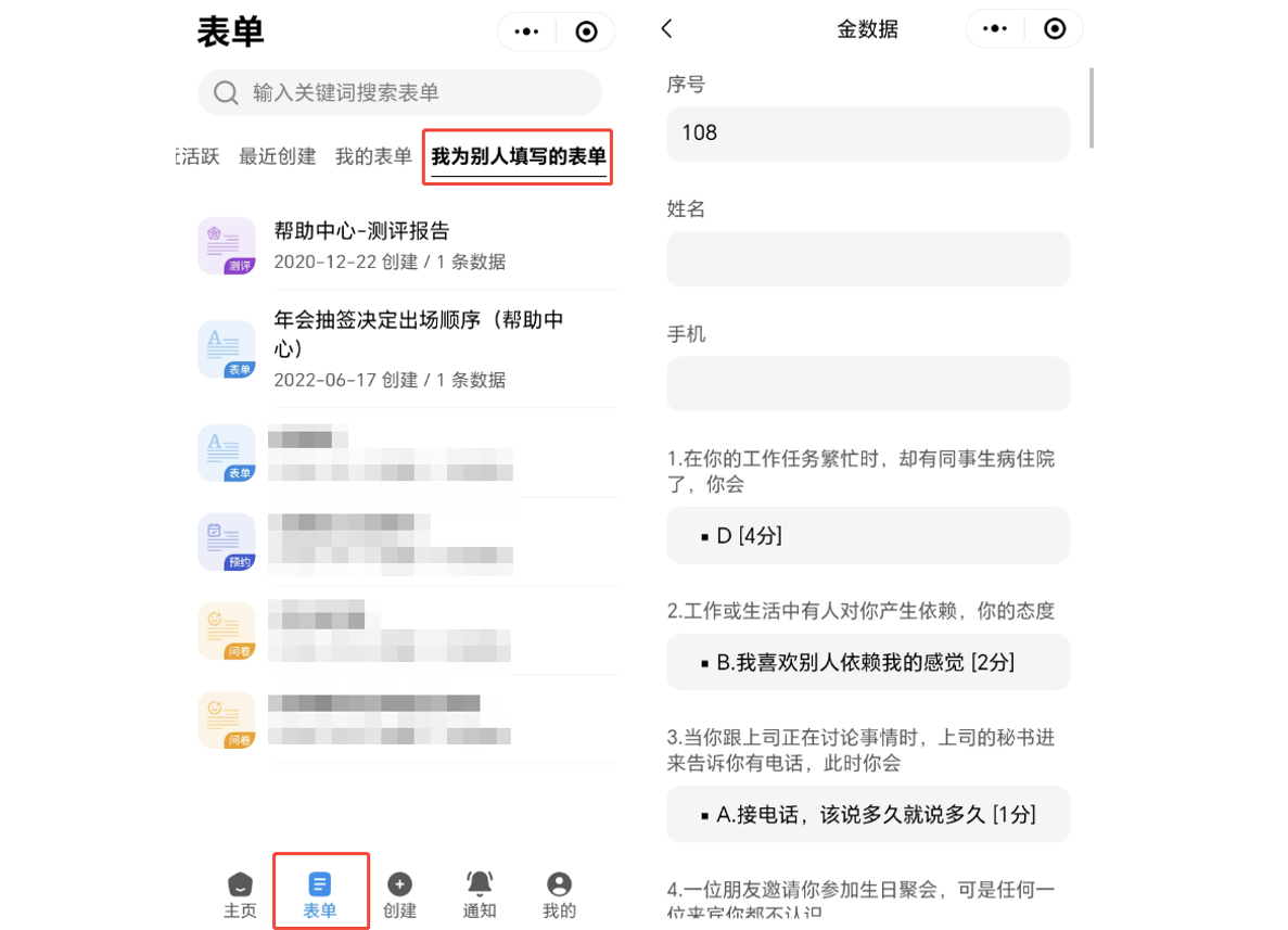 在小程序登录账号,点击「表单——我为别人填写的表单」查看。