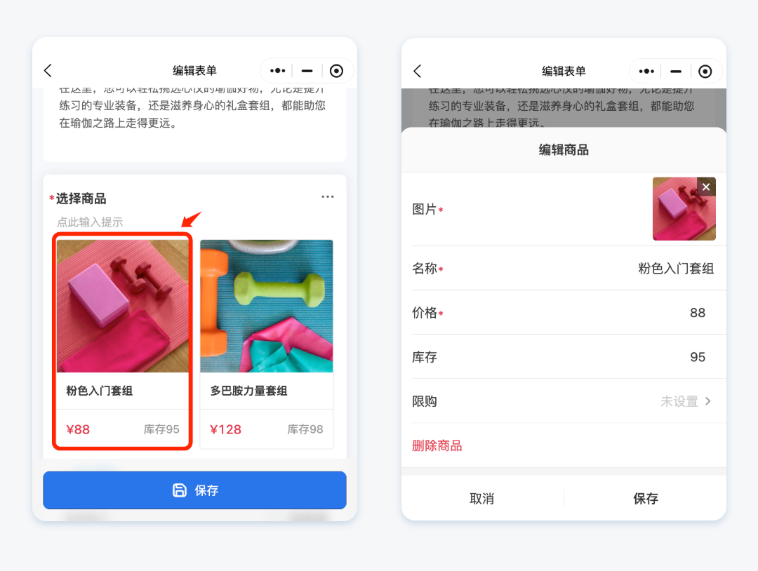点击「配图商品」字段区域,你可以编辑商品,设置商品的:图片、名称、价格、库存,也可以对其进行限购设置,即最少购买/最多购买的数量。