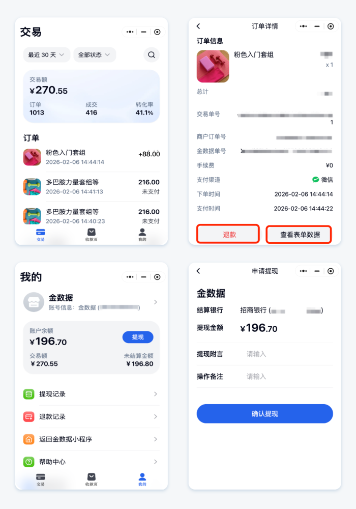 退款与提现一站式处理:售后需要退款、活动结束需要提现,都可在小程序内按流程完成。
