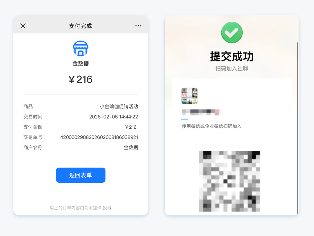 付款成功后,客户会立即收到成功提示,甚至能看到你预设的“入群二维码”或“核销凭证”,流程一气呵成。
