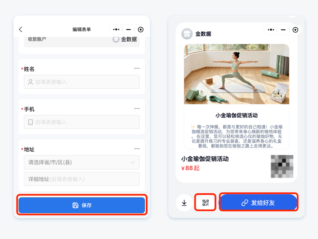 设置完成后,点击「保存-发布」,系统会自动生成一个专属的收款链接和二维码。你可以直接复制转发到微信群、朋友圈,或将链接嵌入到公众号菜单栏中。