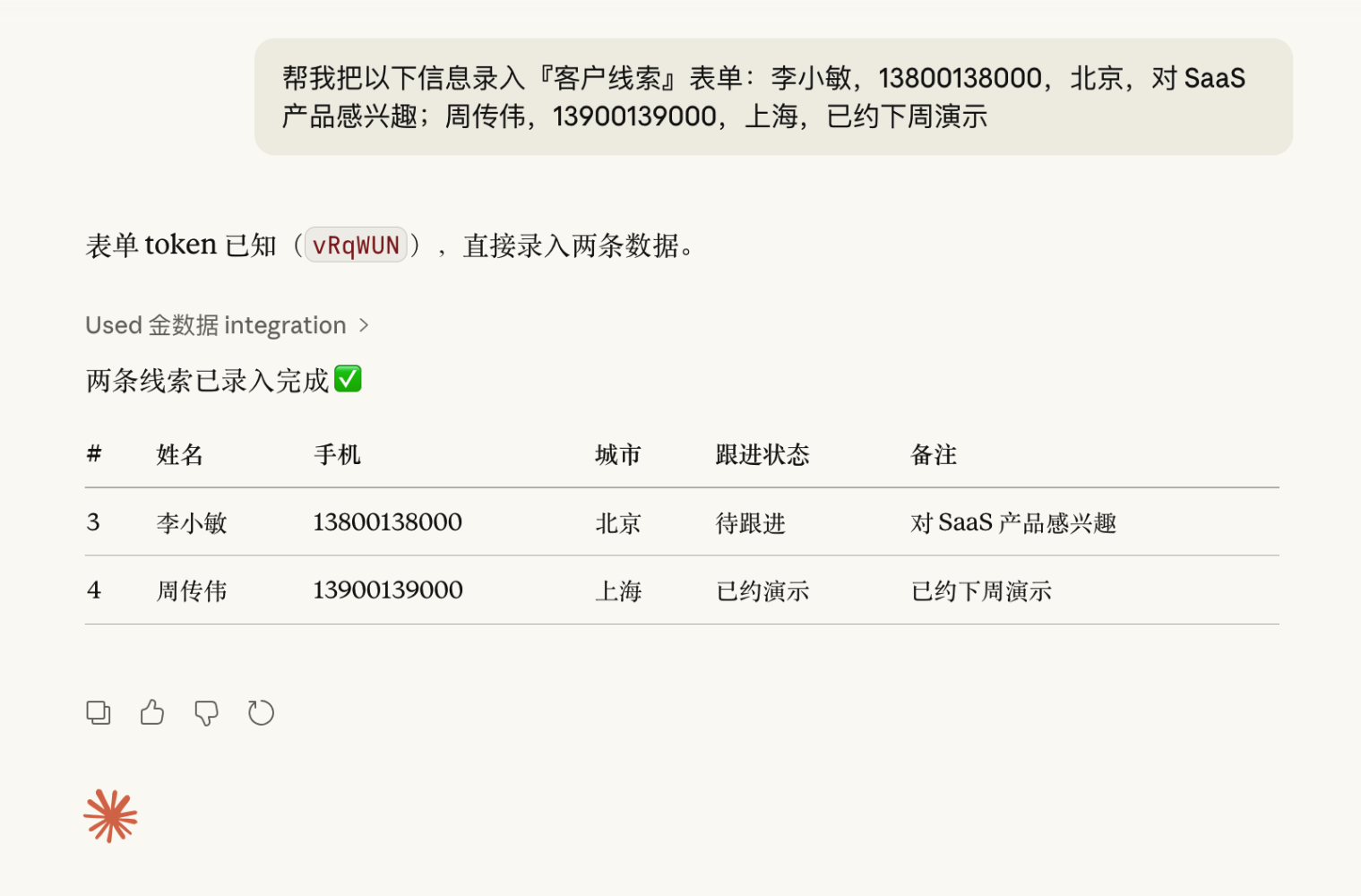 「帮我把以下信息录入『客户线索』表单:李小敏,13800138000,北京,对 SaaS 产品感兴趣;周传伟,13900139000,上海,已约下周演示」