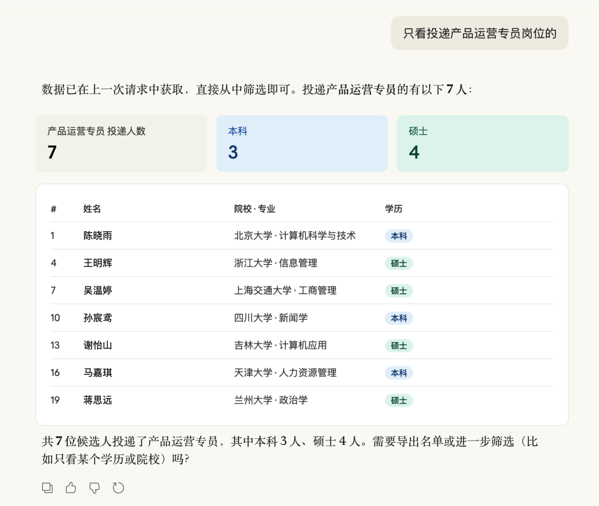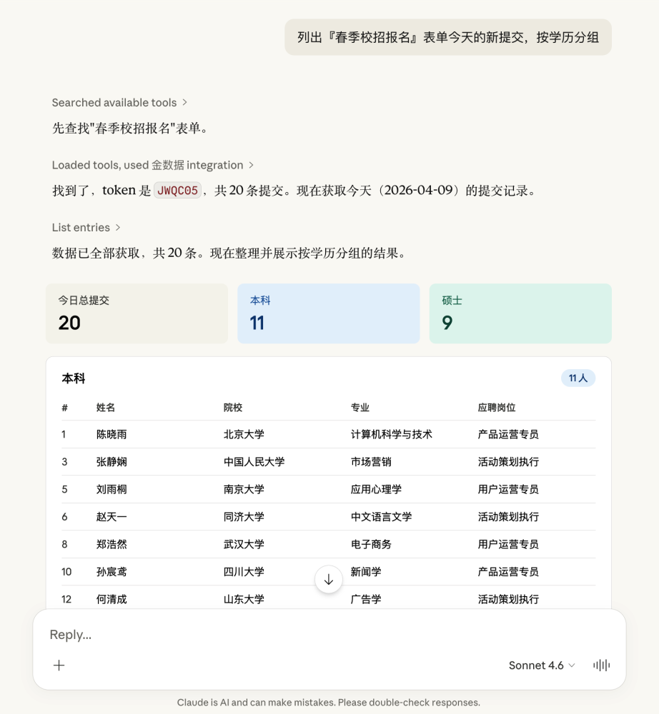 活动开始前,HR 需要确认哪些候选人已提交资料。以前要登录金数据后台、找到表单、翻数据页。现在在 Claude 里直接说: