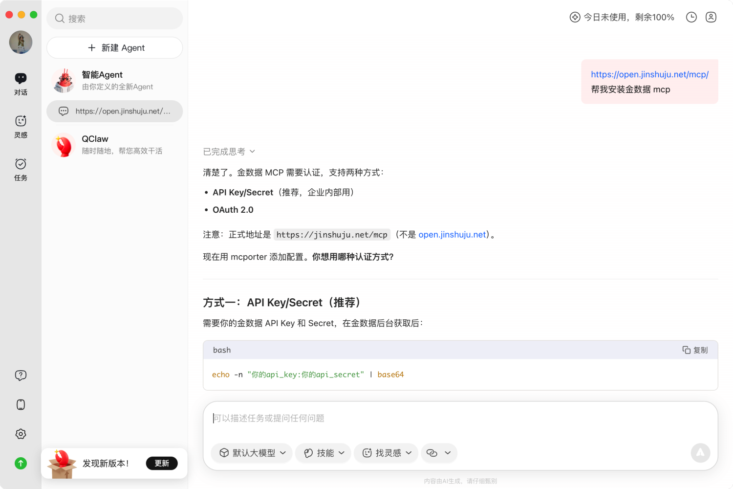 客户端会自动读取文档、完成配置,并引导你通过浏览器完成 OAuth 授权(跳转到金数据登录页,授权后自动返回)。全程不需要手动编辑任何配置文件。