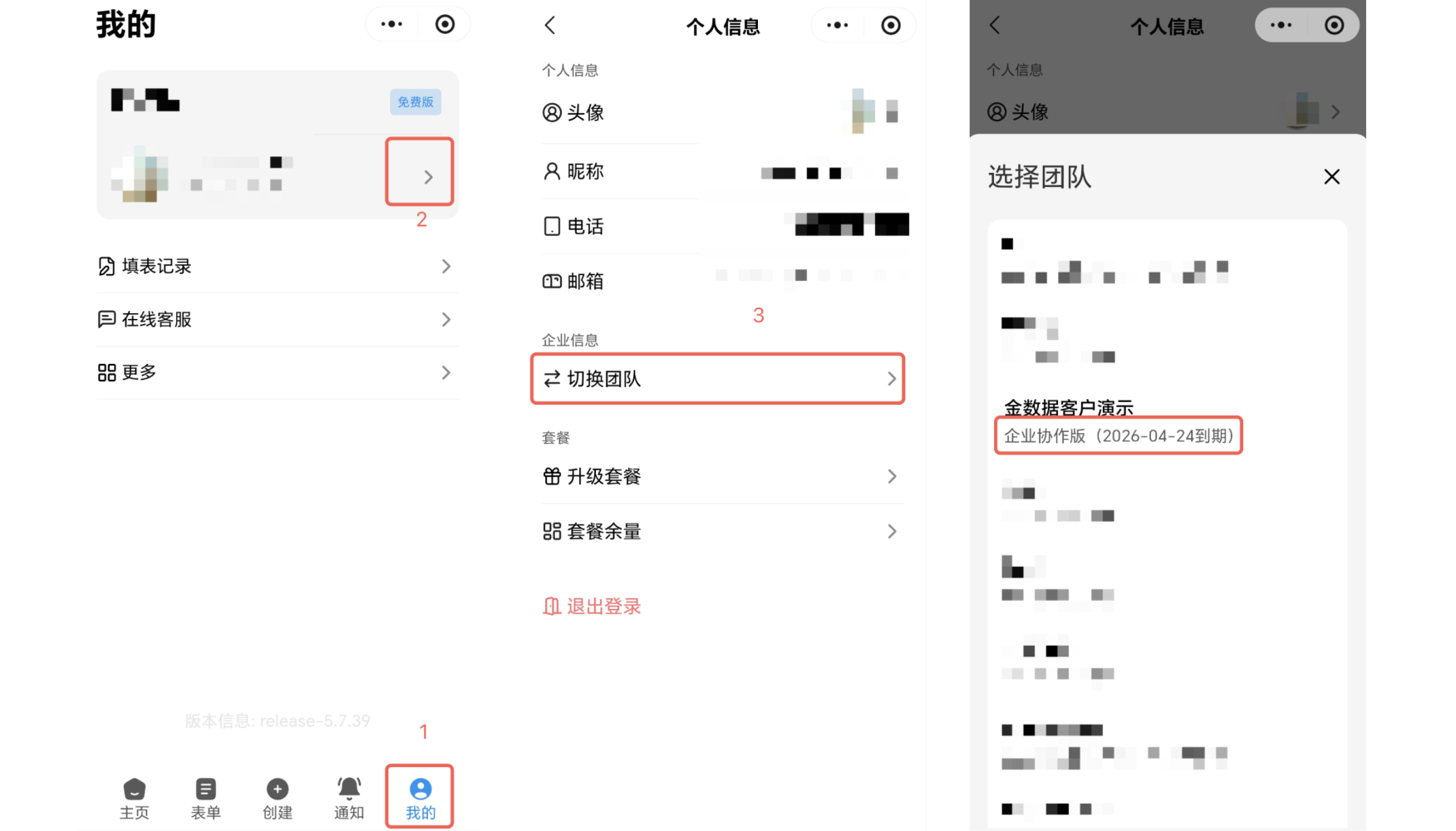首页 / 🔍 帮助文档 / 账号与账单用量 查看套餐有效期 当遇到特定功能使用问题时,可查看该功能的详细说明和操作指南。 PC 端查看登录账号 之后,点击右上角「系统设置——套餐概览」查看套餐有效期。微信小程序查看手机微信小程序搜索「金数据」,登录账号,点击右下角「我的——切换团队」查看套餐有效期。移动端 App 查看进入金数据移动端 App ,登录账号后点击右下角「我的——切换团队」查看套餐有效期。公众号查看手机微信搜索「金数据公众号」,点击「我的表单—— H5 网页」登录账号,点击右下角「我的」,即可在顶部查看账户到期时间。 发布日期:2025年11月18日 有帮助? 是 否