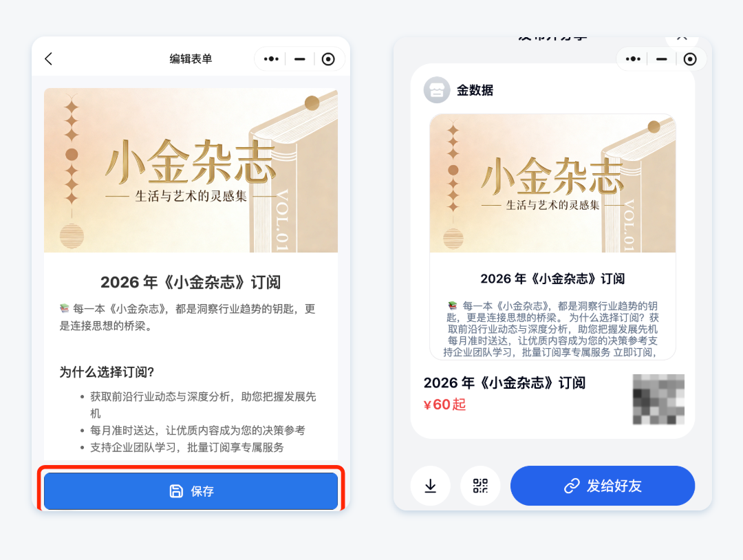 利用金数据,杂志社可以彻底告别“私信转账+手动登记地址”的原始模式,用一个页面解决订阅、收款、开票、信息采集的全链路需求。
