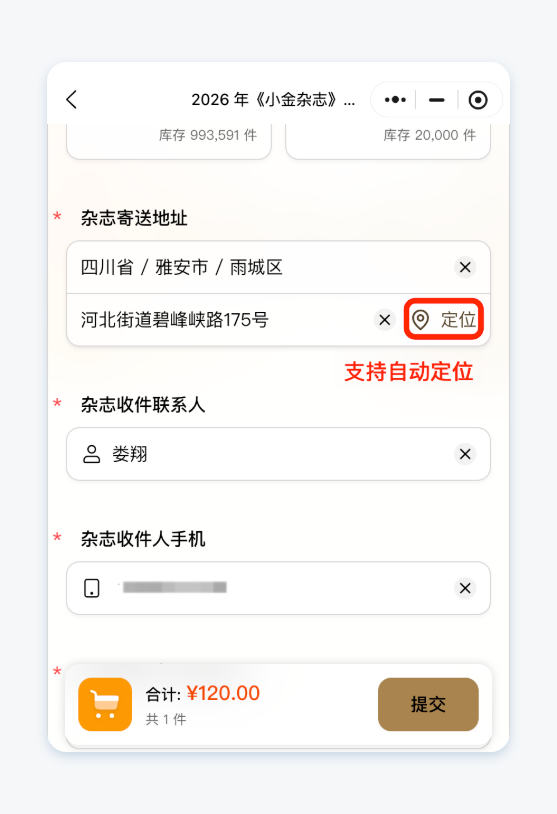 页面会引导读者填写收件人姓名、电话及详细地址。金数据支持地址自动定位,大幅降低地址填写错误的概率。