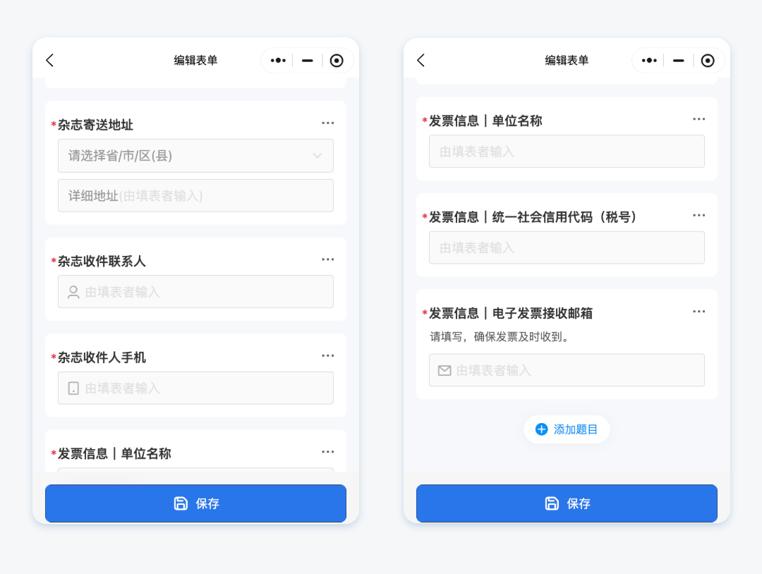 针对发票需求,可添加「单行文本」字段收集抬头、税号,并添加「邮箱」字段,用来接收发票。