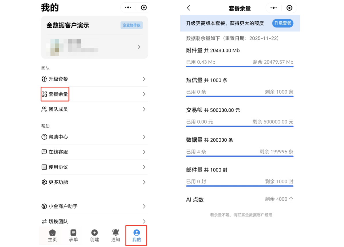 手机微信小程序搜索「金数据」,登录账号,点击右下角「我的——套餐余量」。