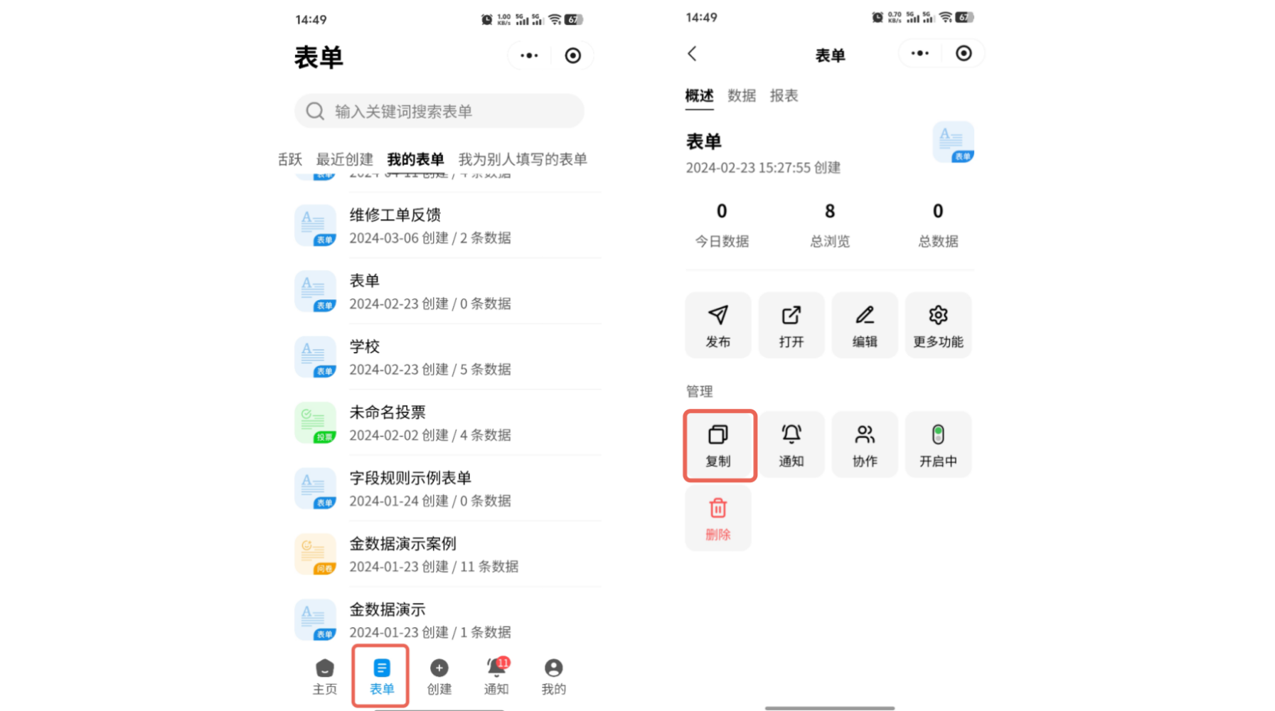 小程序端,你可进入表单概述页面,点击「复制」,快速生成一份全新的表单副本。复制的表单将保留原表单的字段设置,包括必填项、默认值、字段类型等。