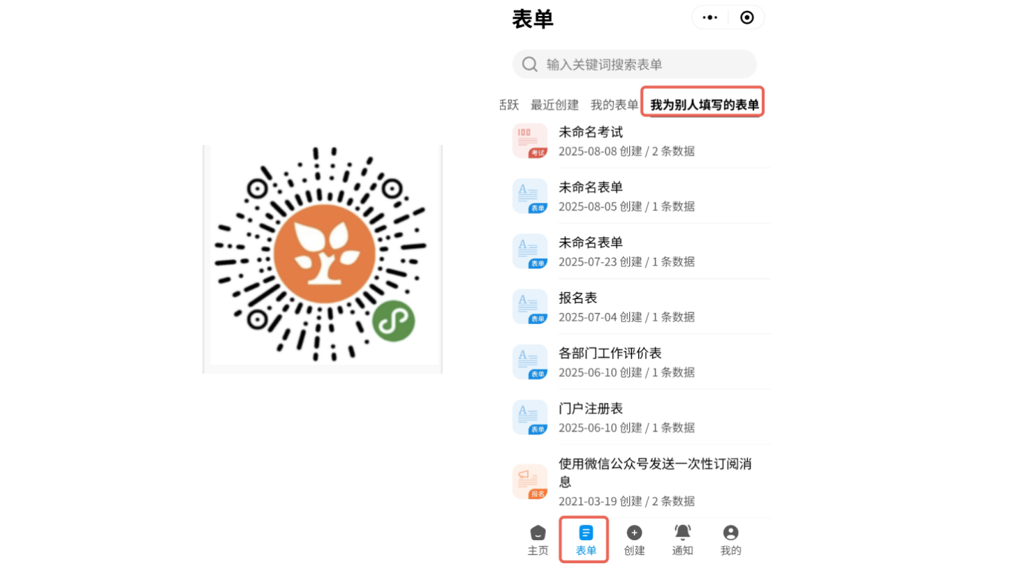 3)二维码:可生成表单小程序码,你可以将此图片发送给微信好友、微信群、朋友圈,或者插入到微信文章。