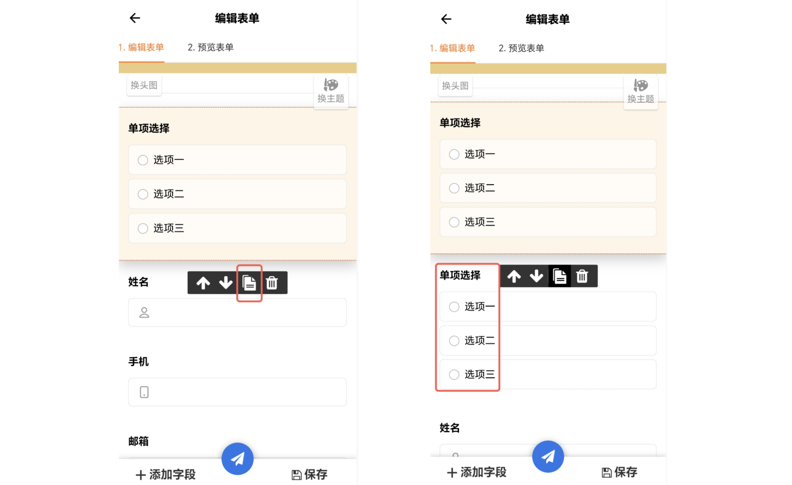 在编辑页面点击需要复制的那个字段,字段下方会显示几个按钮,点击「复制」按钮,字段下方会生成一个完全相同的字段。