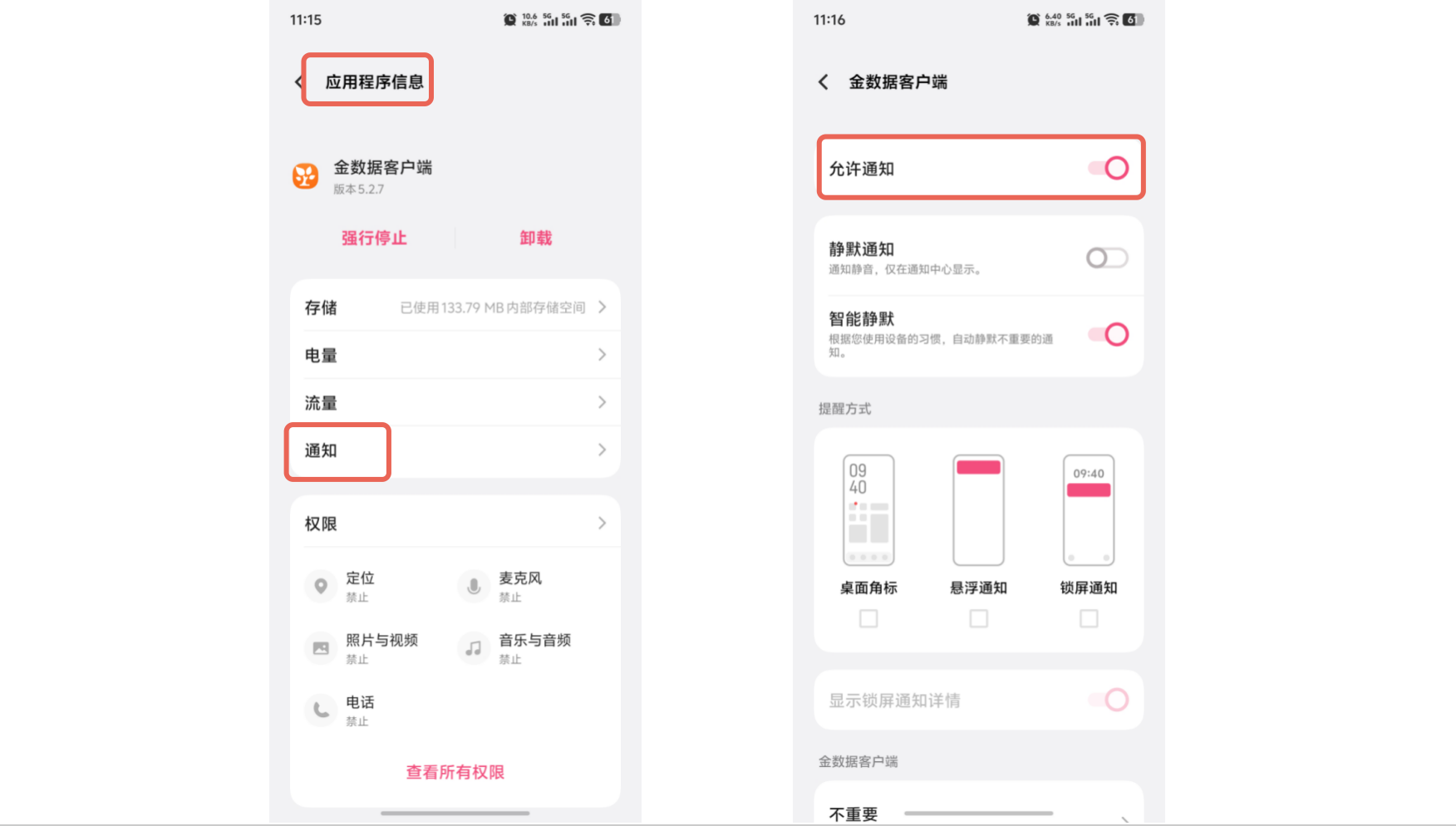 找到「应用管理」或「通知管理」,进入“金数据”应用的应用信息页。