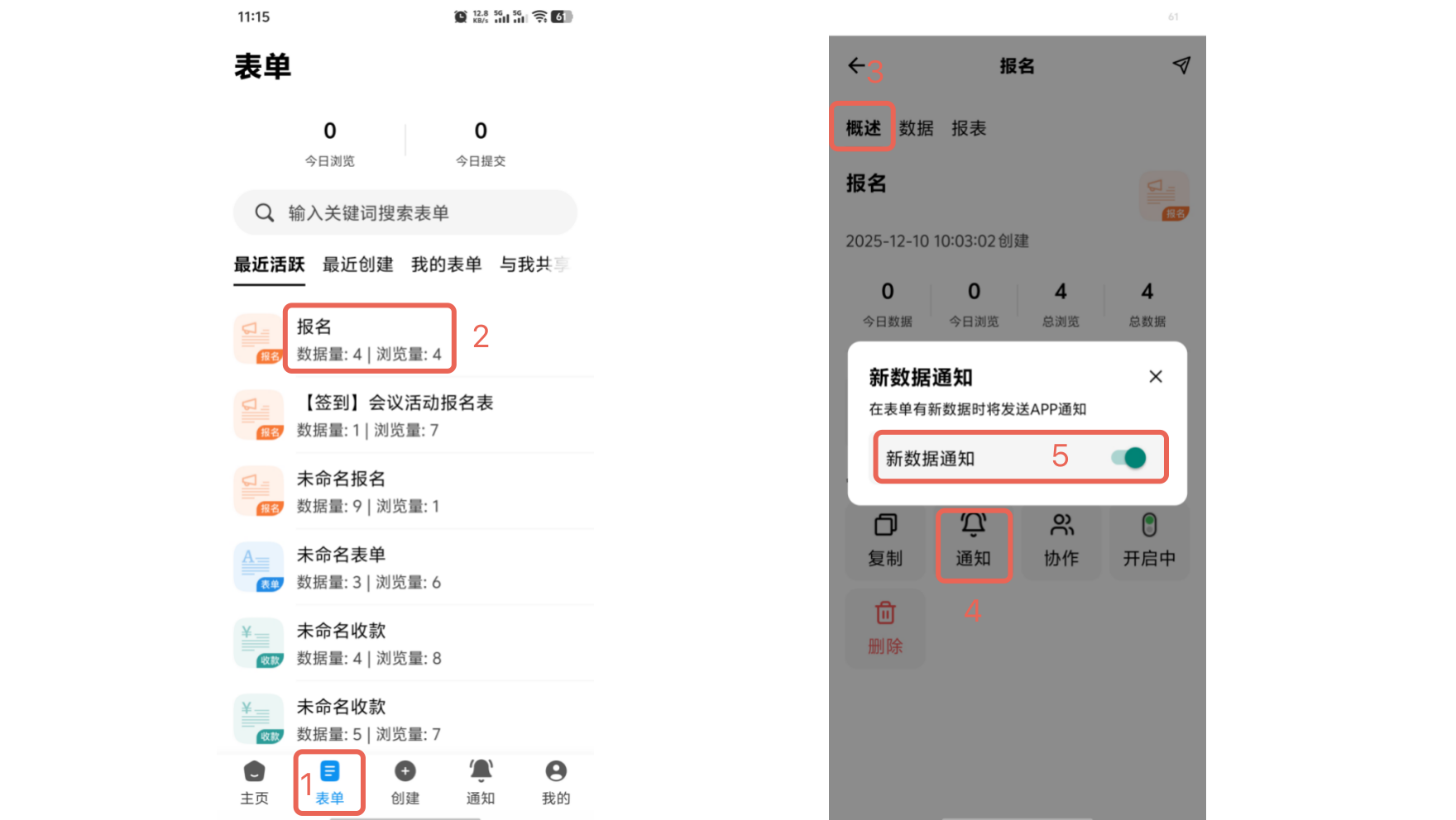 在 App 的「表单」板块中,点击需要开启新数据通知的表单标题进入「概述」页面,在通知中开启新数据通知即可。