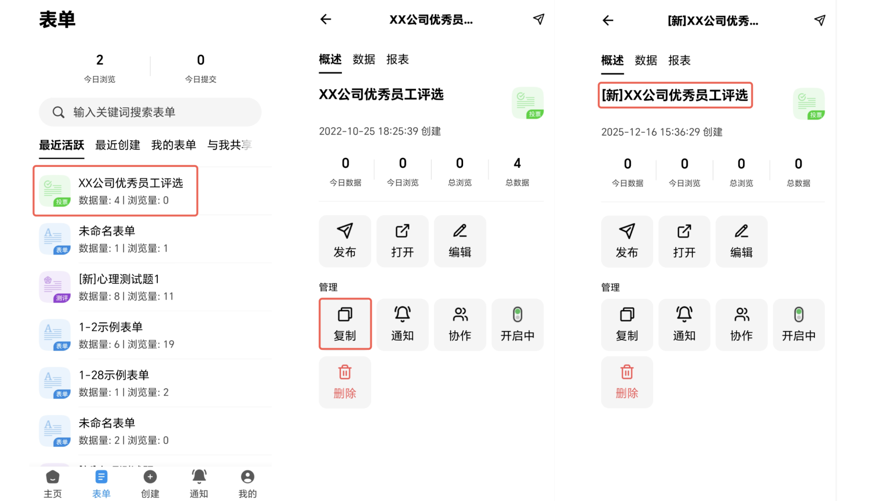 找到你想复制的表单,点击进入其「概述」页面,点击「复制」即可生成一份新表单。复制后的表单会保留原表单的字段、样式、必填设置等,但不会复制已提交的数据。