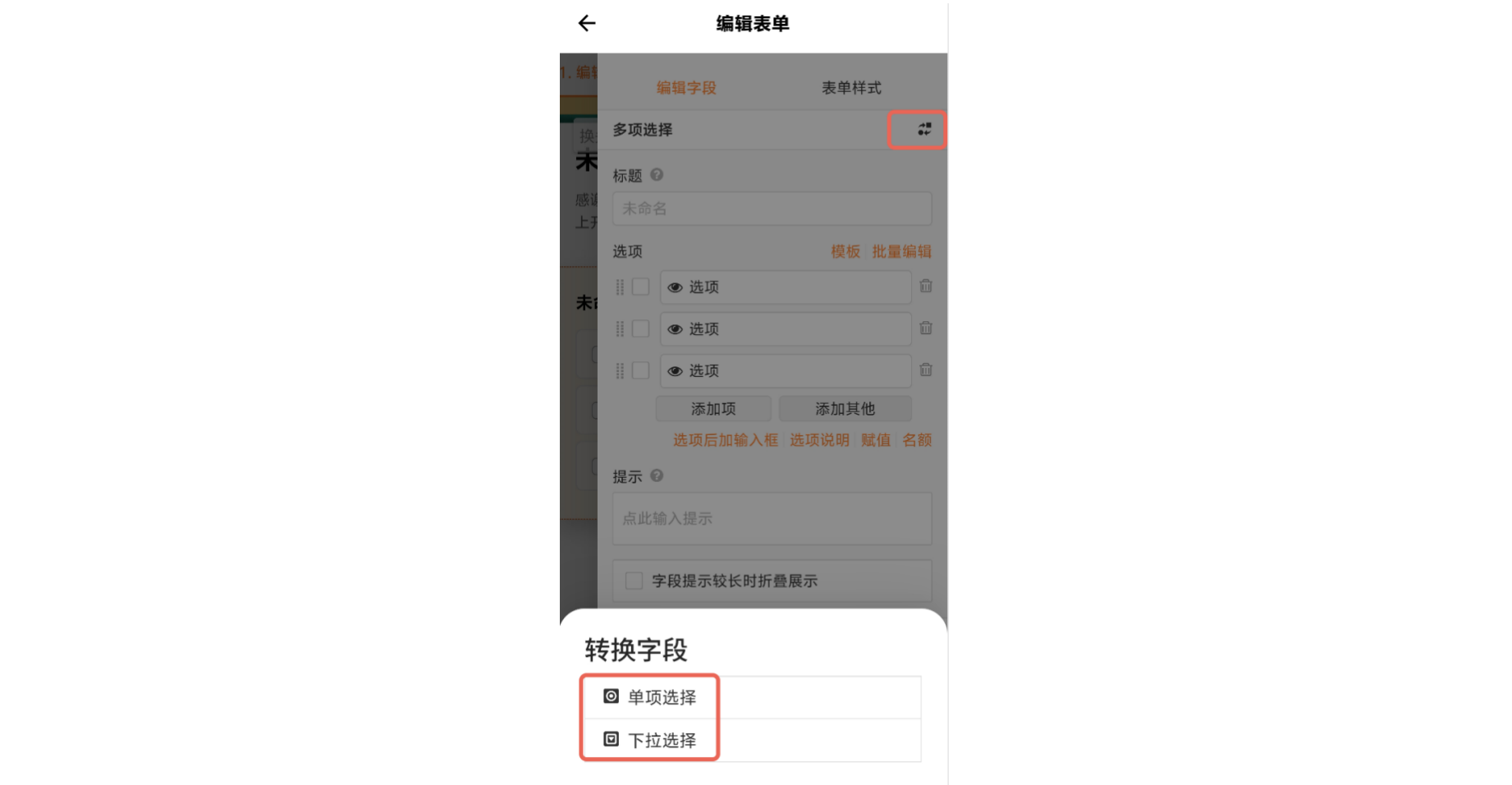 ⚠️注意:多项选择字段收集到数据后无法切换为单项选择。