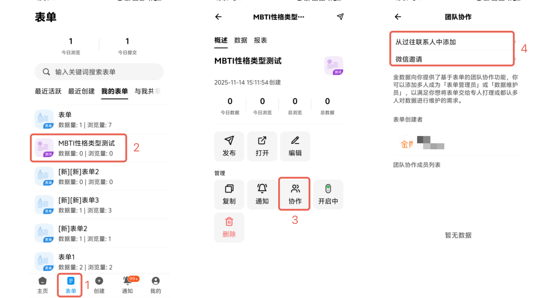 在 App 的「表单」板块中,点击需要协作的表单标题进入「概述」页面,选择「协作」按钮后,你可以从过往联系人中添加协作成员,或通过微信发送邀请链接。