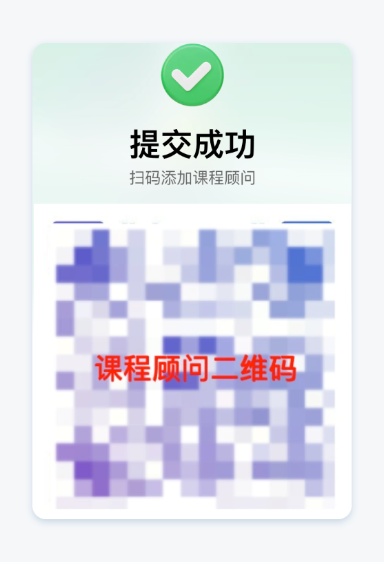 支付成功后,报名成功页面可展示配置好的课程顾问二维码,实现从“交钱”到“服务”的无缝衔接。