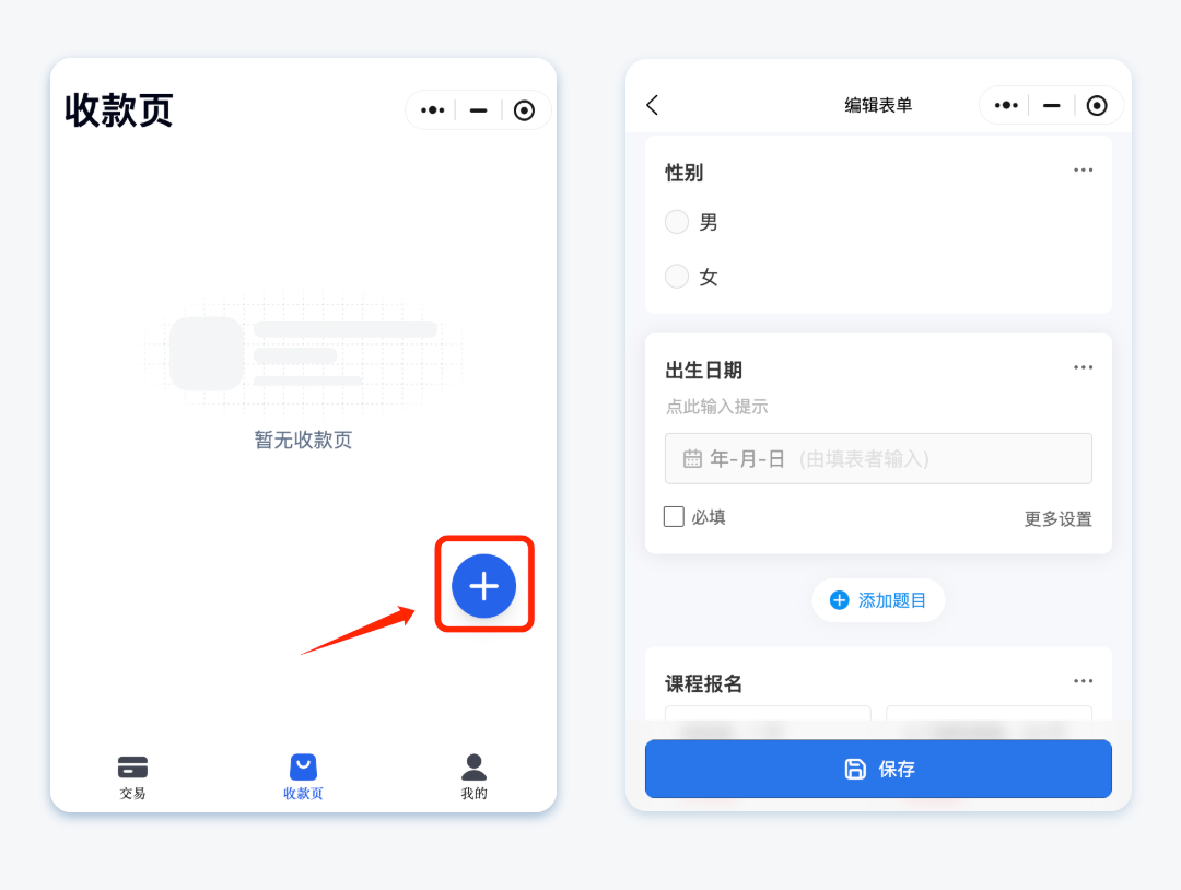 在「收款」页,点击「+」创建收款表单。添加“姓名”、“联系电话”、“学员年龄”等基础信息字段。